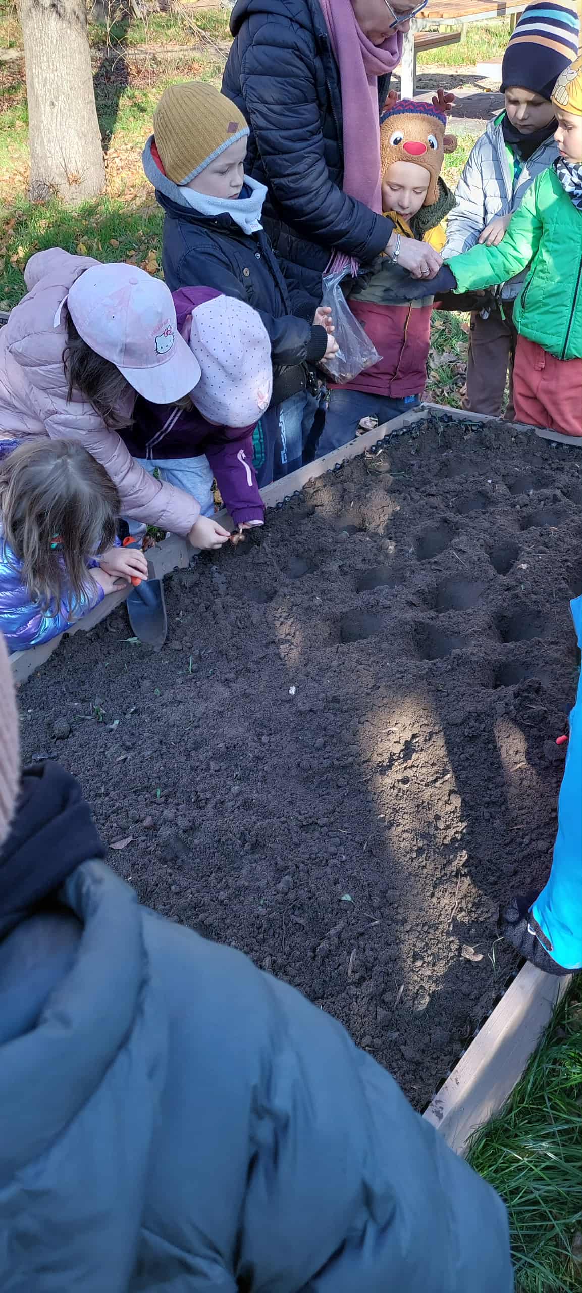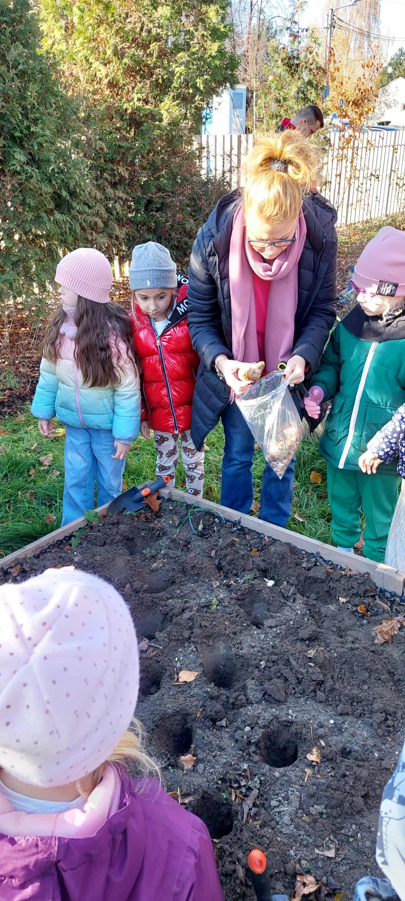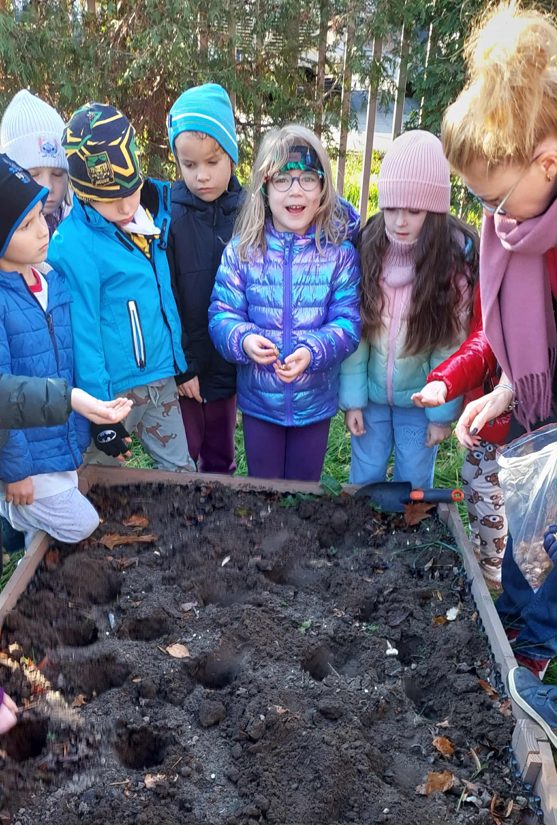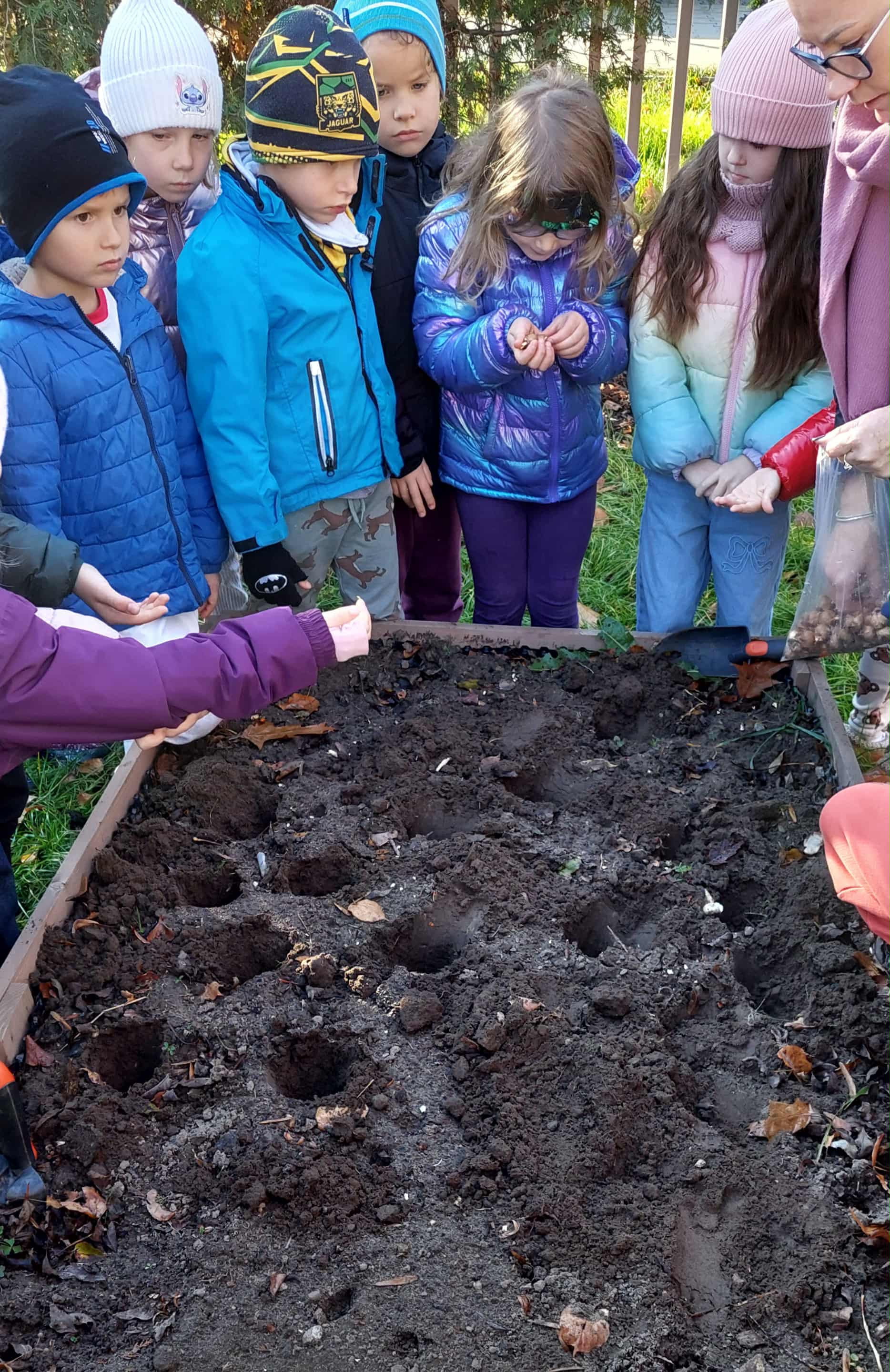 Dzieci ze wszystkich grup, pod opieką nauczycieli, zaangażowały się w tworzenie kolorowego wiosennego zakątka w ogrodzie przedszkolnym. Przedszkolaki z dużym entuzjazmem uczestniczyły w przygotowaniu gleby, poznawały etapy wzrostu roślin oraz uczyły się, jak dbać o cebulki, aby już wczesną wiosną mogły zakwitnąć piękne, kolorowe krokusy. Dla wielu dzieci była to pierwsza okazja, aby samodzielnie posadzić roślinę – tym większa była radość i satysfakcja z wykonanej pracy. Celem akcji było nie tylko upiększenie naszego otoczenia, ale również kształtowanie postawy troski o przyrodę, rozwijanie wrażliwości ekologicznej oraz nauka poprzez praktyczne działanie.