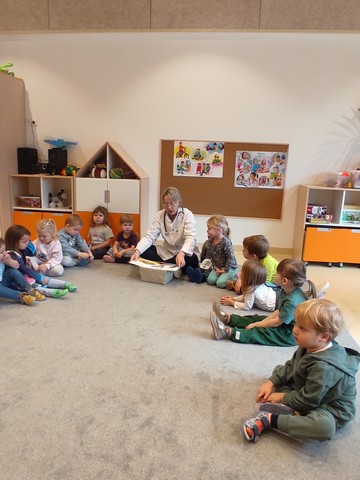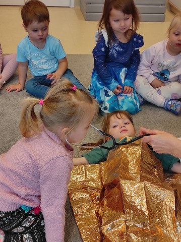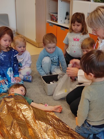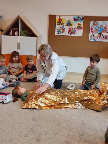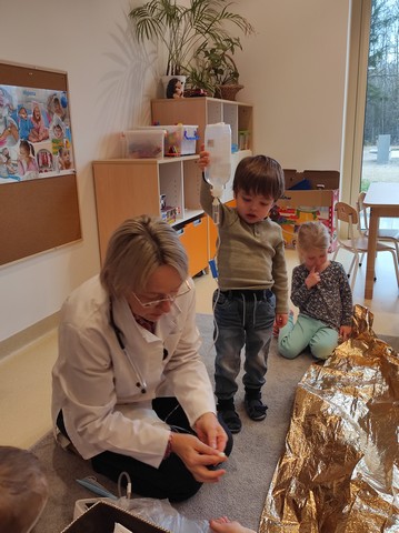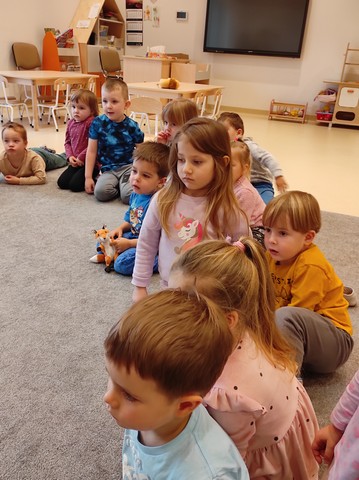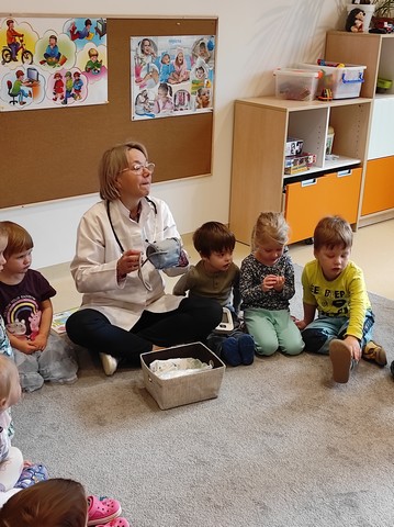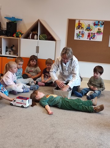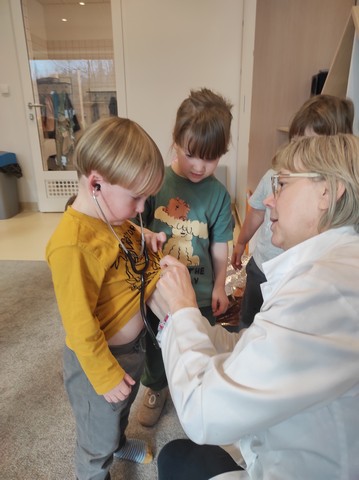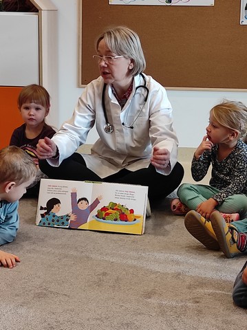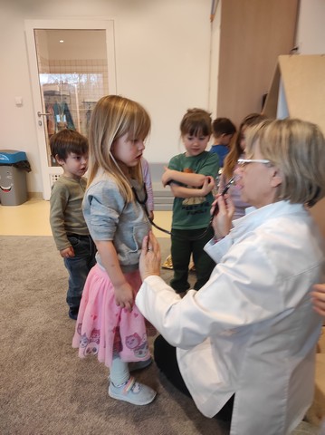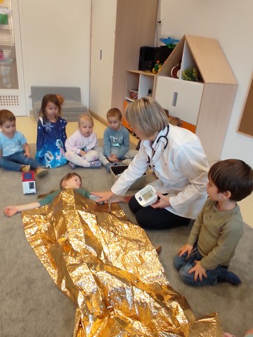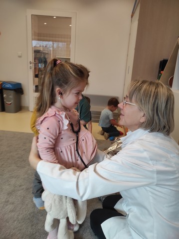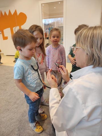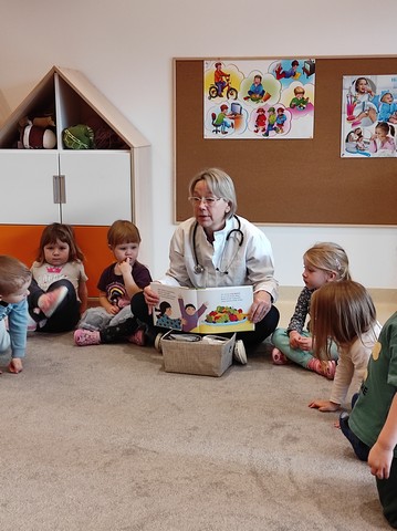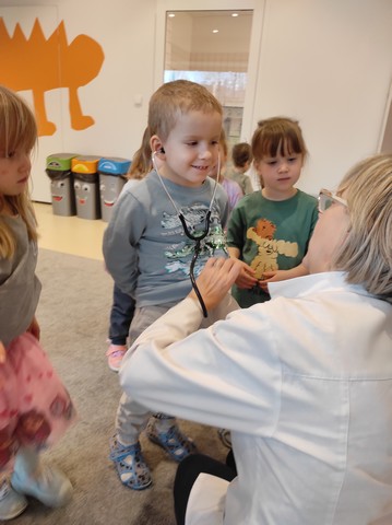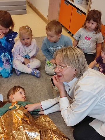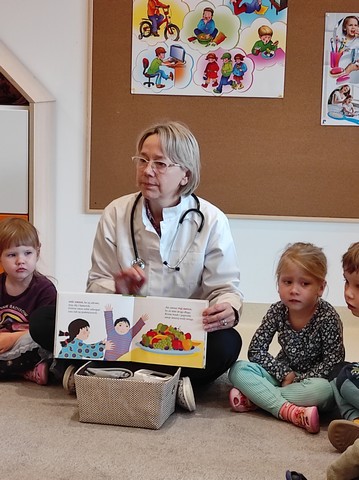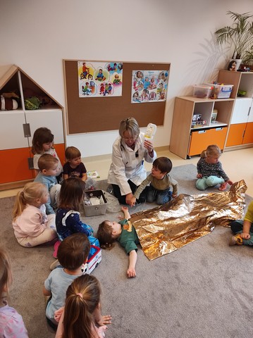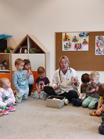 18 listopada pielęgniarka Dorotka rozmawiała z dziećmi na temat zdrowia, higieny i profilaktyki. Podczas spotkania zaprezentowała narzędzia pracy tj: stetoskop, termometr, opatrunki, strzykawki, ciśnieniomierz oraz koc termiczny. Odpowiadała na pytania dzieci i przeprowadzała zabawy edukacyjne. Chętne dzieci mogły posłuchać bicia własnego serca.