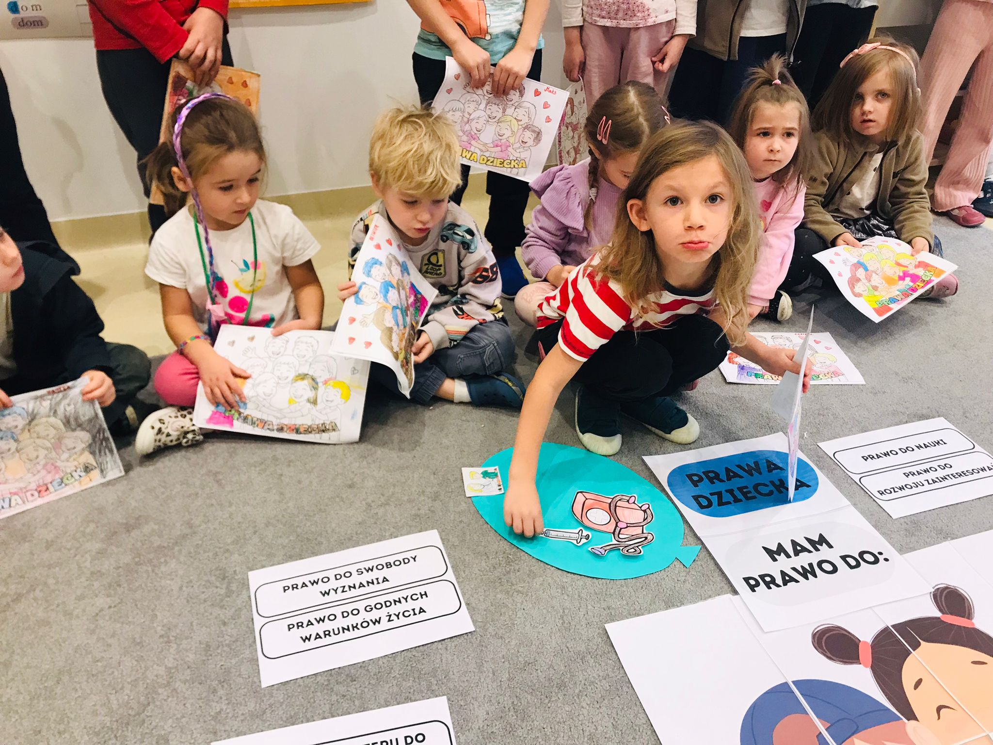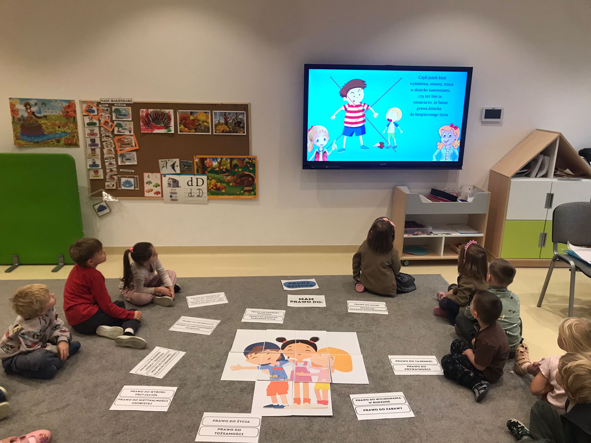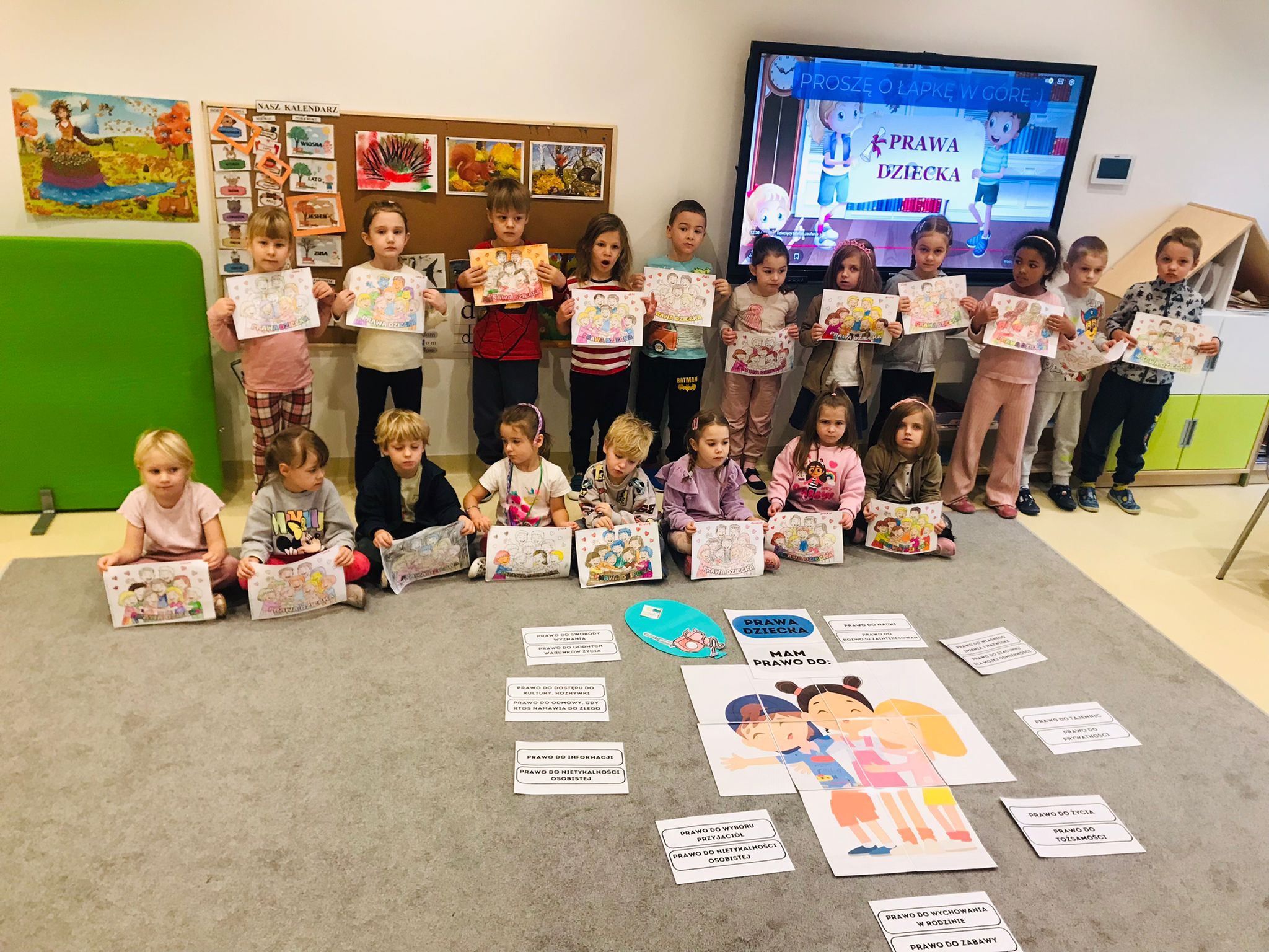 Zajęcia rozpoczęły się rozmową z dziećmi na temat najważniejszych praw, takich jak prawo do zabawy, nauki, opieki, miłości, równego traktowania oraz wyrażania własnego zdania. Dzieci dzieliły się swoimi doświadczeniami, opowiadały o sytuacjach, w których czuły się bezpieczne, kochane i wysłuchane. Rozmowa była prowadzona w sposób dostosowany do wieku przedszkolaków – poprzez przykłady, ilustracje i krótkie historyjki.