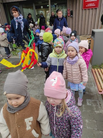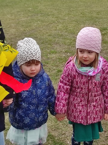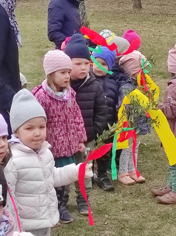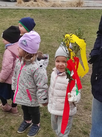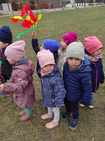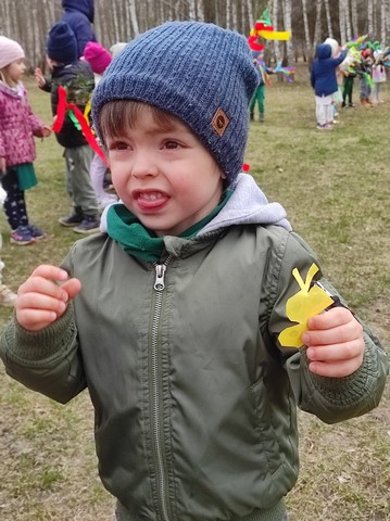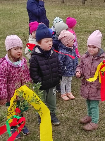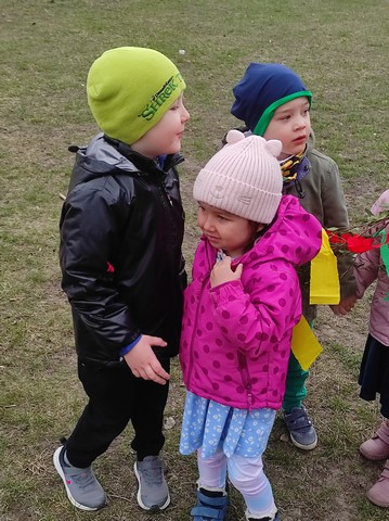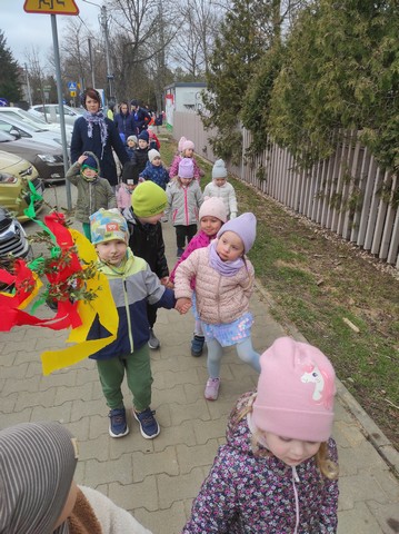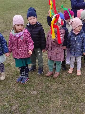 20 marca dzieci obejrzały film pt;,Pierwsze zwiastuny wiosny", a około godziny 11.00 kolorowym korowodem wybraliśmy się z Marzanną do pobliskiego lasku aby pożegnać zimę oraz poszukać oznak wiosny.
