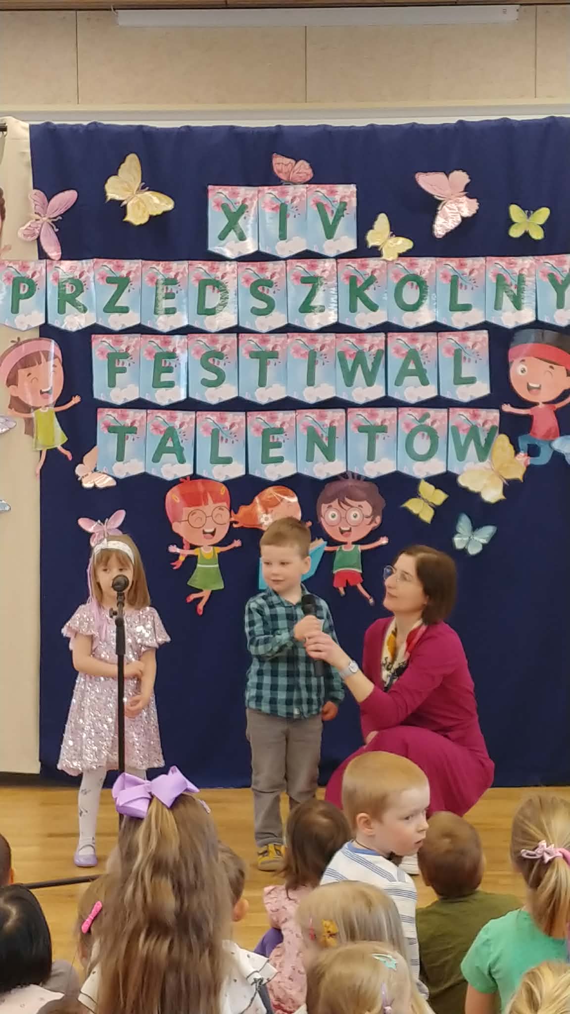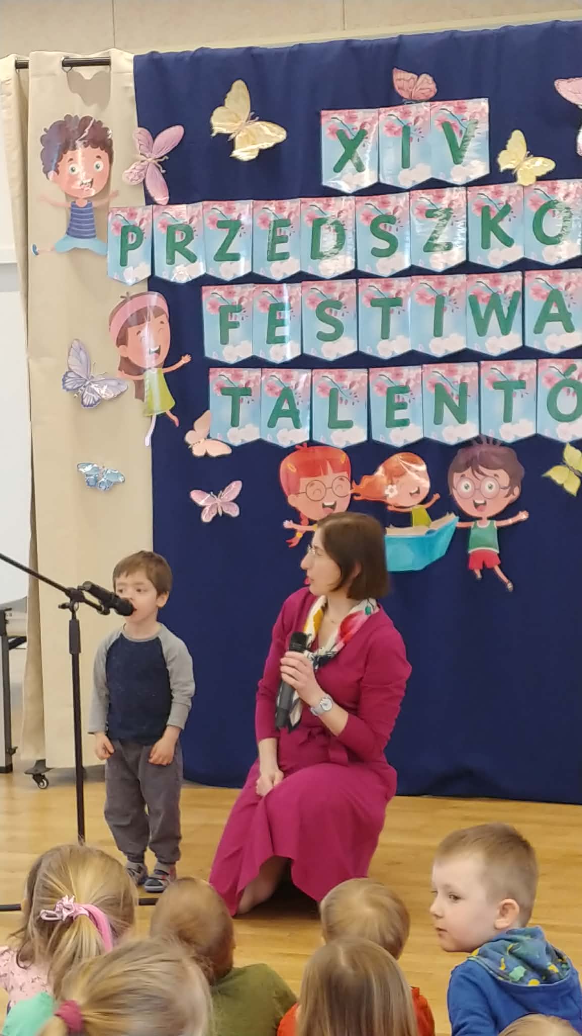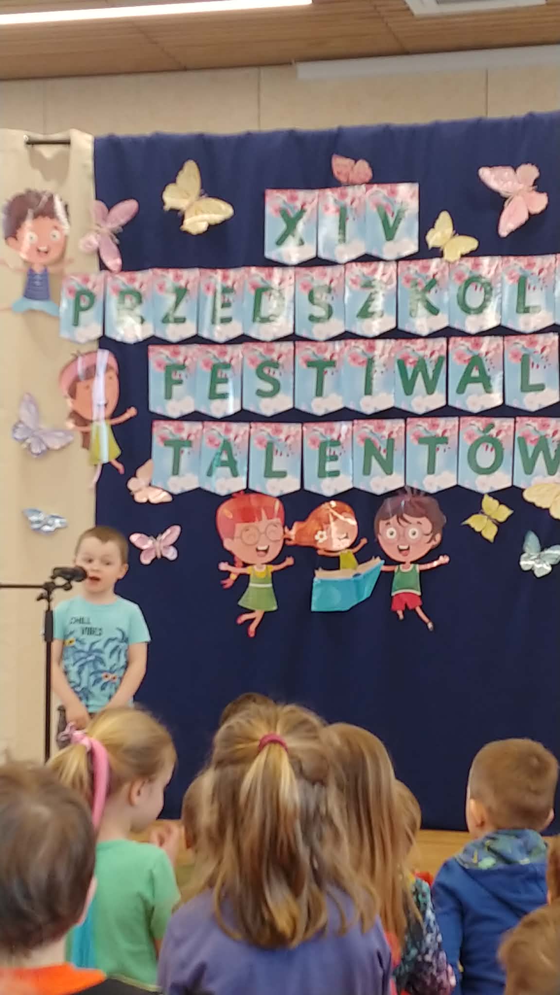 25 marca odbył się w naszym przedszkolu XIV Festiwal Talentów. Do tradycji naszego Przedszkola weszło już powitanie wiosny występami artystycznymi utalentowanych dzieci. Widownia złożona z przedszkolaków, rodziców, nauczycielek i zaproszonych gości gromko oklaskiwała występy. Do udziału w Festiwalu uczestnicy zgłaszali się sami, lub w ich imieniu czynili to rodzice oraz nauczycielki. Impreza daje przestrzeń do artystycznej ekspresji dzieciom, które lubią występować i odnajdują się na scenie. Liczna publiczność zgromadzona w sali widowiskowej przedszkola podziwiała występy wokalne, recytację, taniec, grę na instrumentach. Dzieci z uwagą i zainteresowaniem obserwowały kolegę rozpoznającego flagi dalekich krajów i pokazującego położenie ich na mapie. Ważnym elementem Festiwalu, była jak co roku wystawa prac plastycznych i konstrukcyjnych z wykorzystaniem rozmaitych technik.