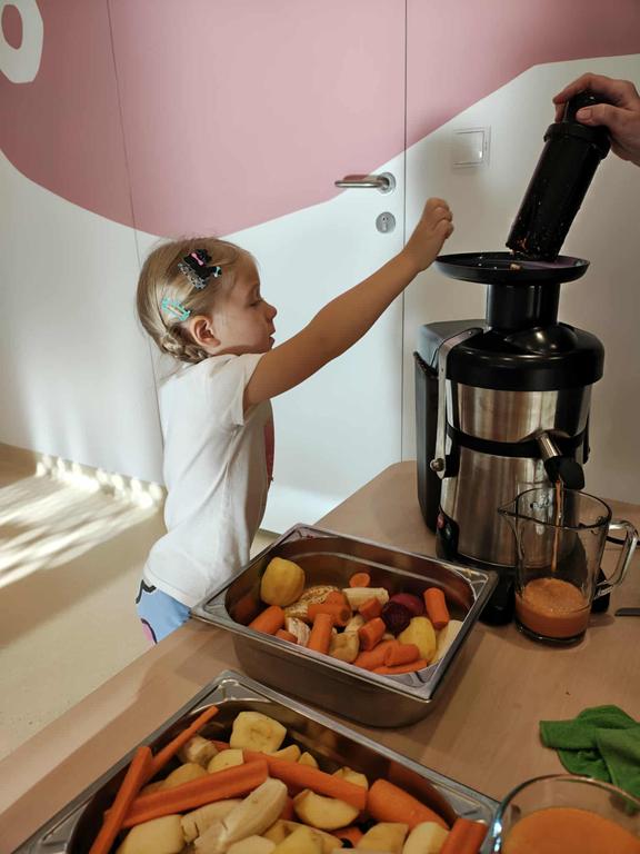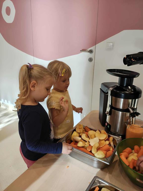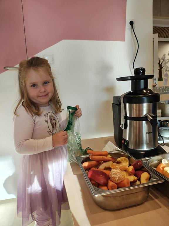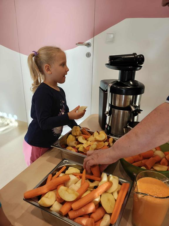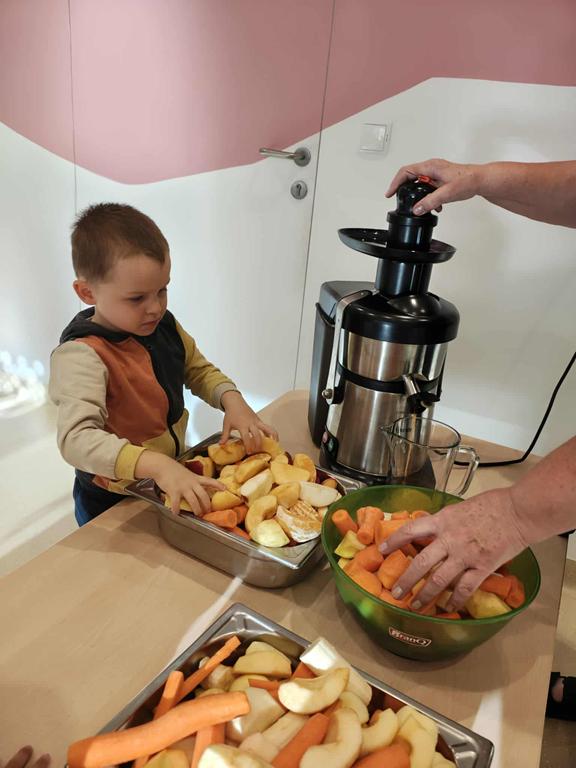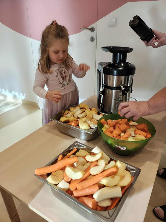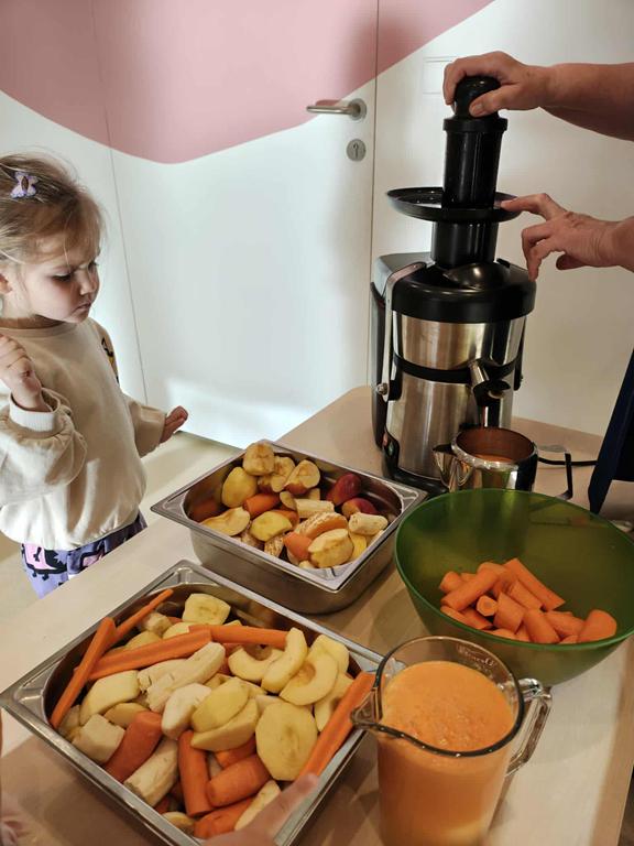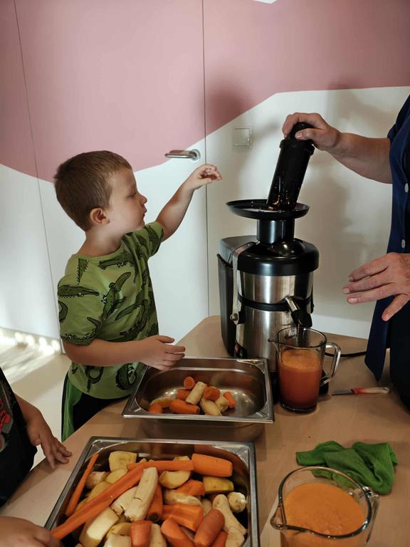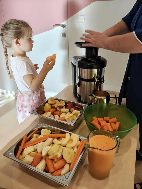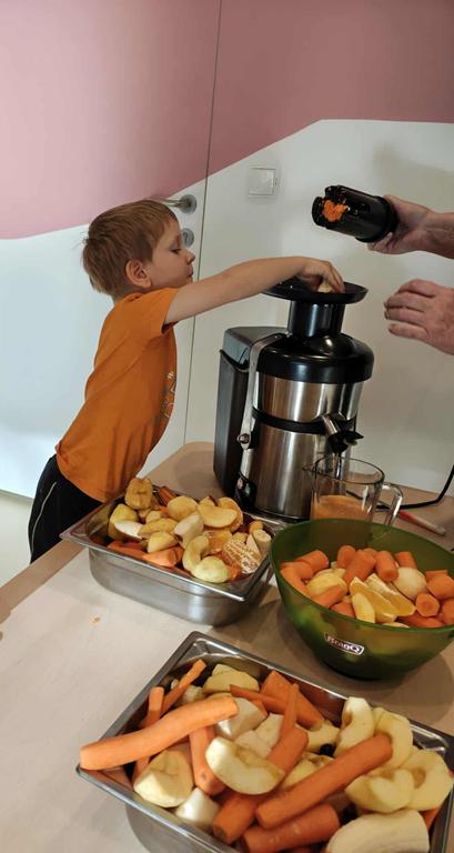 W poniedziałek 20 października w grupie Liski było smacznie, zdrowo i kolorowo. W tym dniu dzieci rozwijały swoje umiejętności kulinarne. Z owoców i warzyw wykonywały samodzielnie zdrowy sok owocowo-warzywny. Przed przystąpieniem do pracy dzieci poszerzały swoją wiedzę na temat zdrowego odżywiania. Zapoznały się także z urządzeniem elektrycznym gospodarstwa domowego -sokowirowką, jej wyglądem i działaniem. Następnie,po dokonaniu niezbędnych czynności higienicznych dzieci przystąpiły do pracy. Z radością obserwowały jak dzbanek napełnia się pomarańczowym napojem. Nasze czterolatki z apetytem wypijały samodzielnie zrobiony sok. Były nawet dokładki! Po pysznym napoju pozostały tylko kolorowe wąsy.