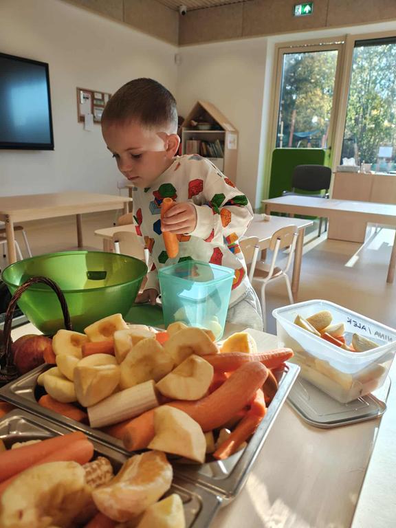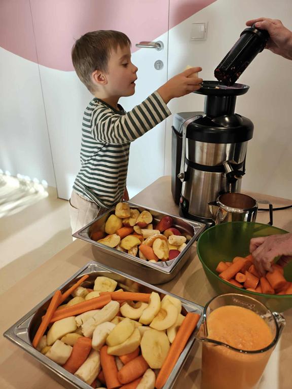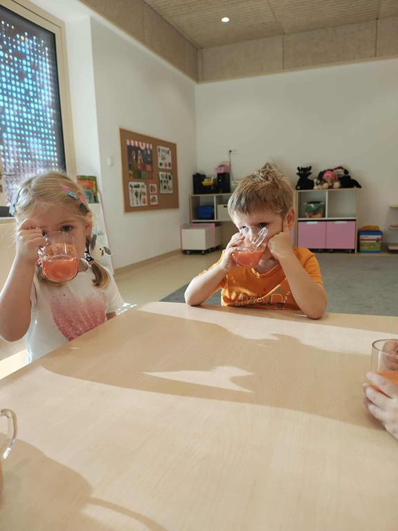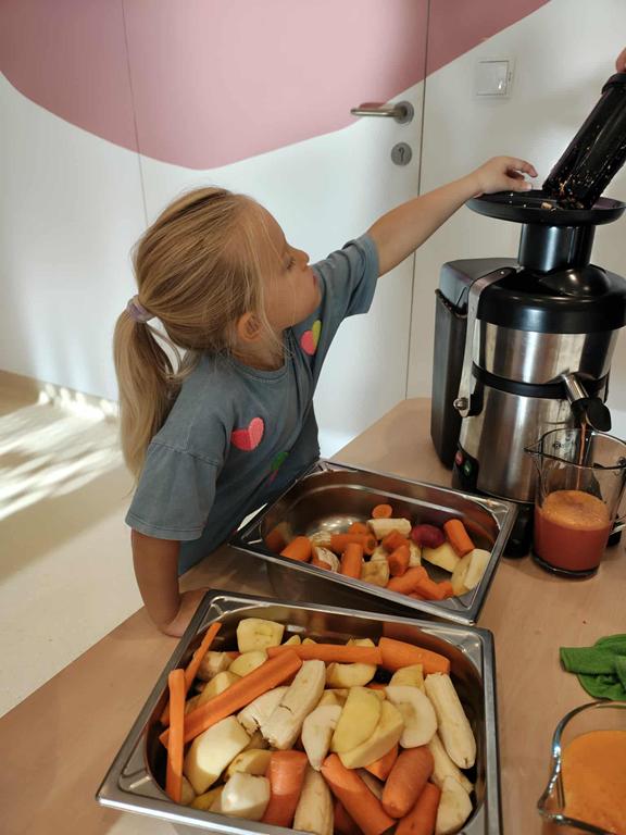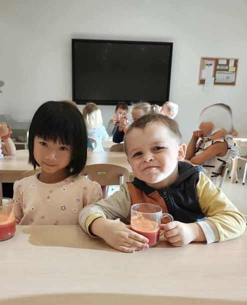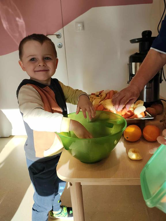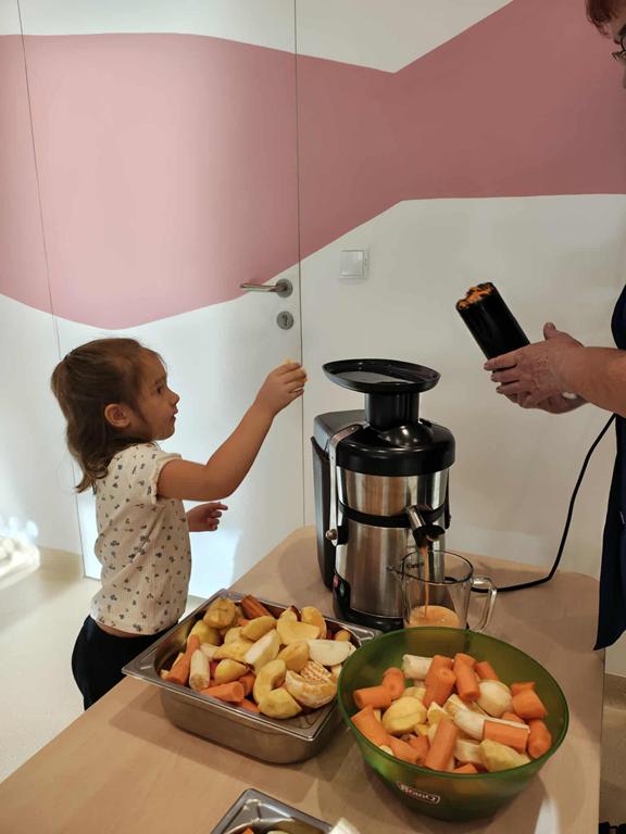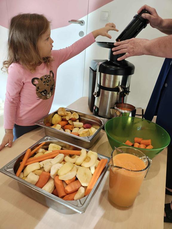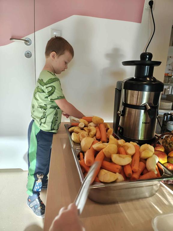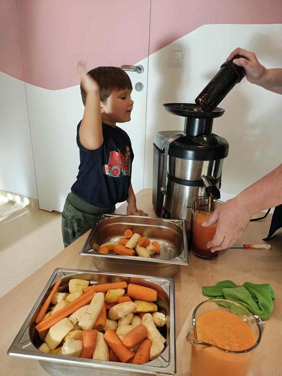 W poniedziałek 20 października w grupie Liski było smacznie, zdrowo i kolorowo. W tym dniu dzieci rozwijały swoje umiejętności kulinarne. Z owoców i warzyw wykonywały samodzielnie zdrowy sok owocowo-warzywny. Przed przystąpieniem do pracy dzieci poszerzały swoją wiedzę na temat zdrowego odżywiania. Zapoznały się także z urządzeniem elektrycznym gospodarstwa domowego -sokowirowką, jej wyglądem i działaniem. Następnie,po dokonaniu niezbędnych czynności higienicznych dzieci przystąpiły do pracy. Z radością obserwowały jak dzbanek napełnia się pomarańczowym napojem. Nasze czterolatki z apetytem wypijały samodzielnie zrobiony sok. Były nawet dokładki! Po pysznym napoju pozostały tylko kolorowe wąsy.