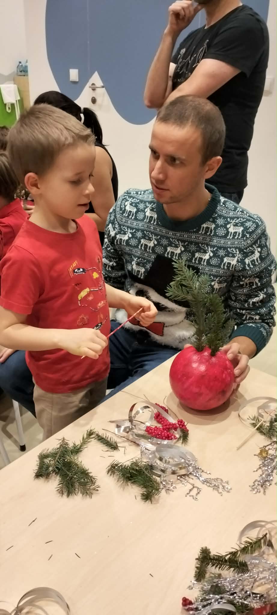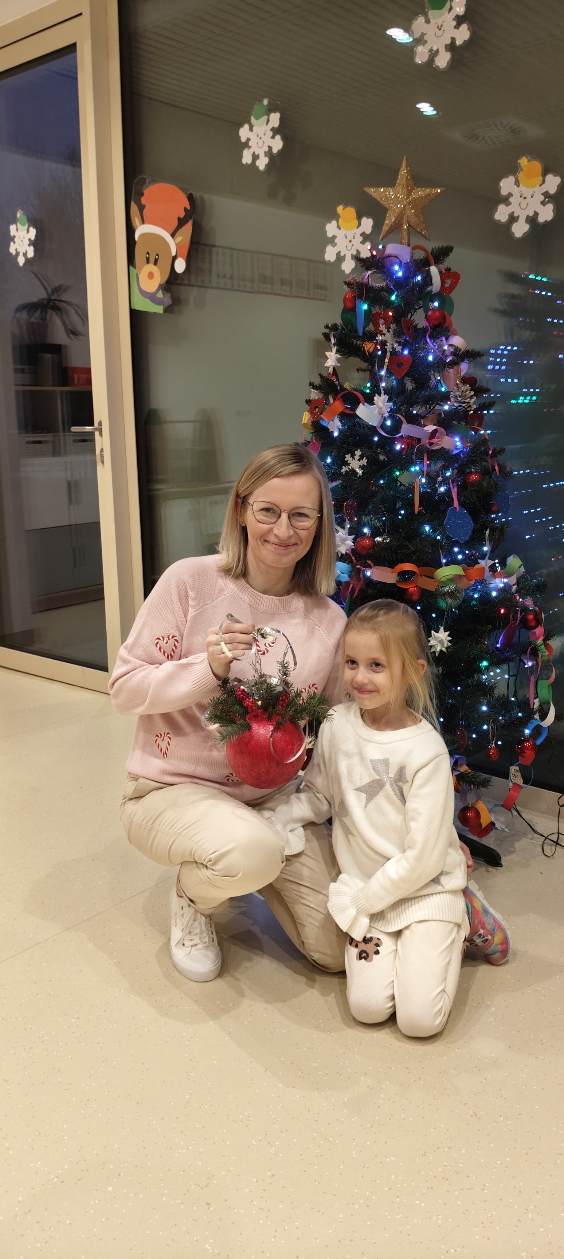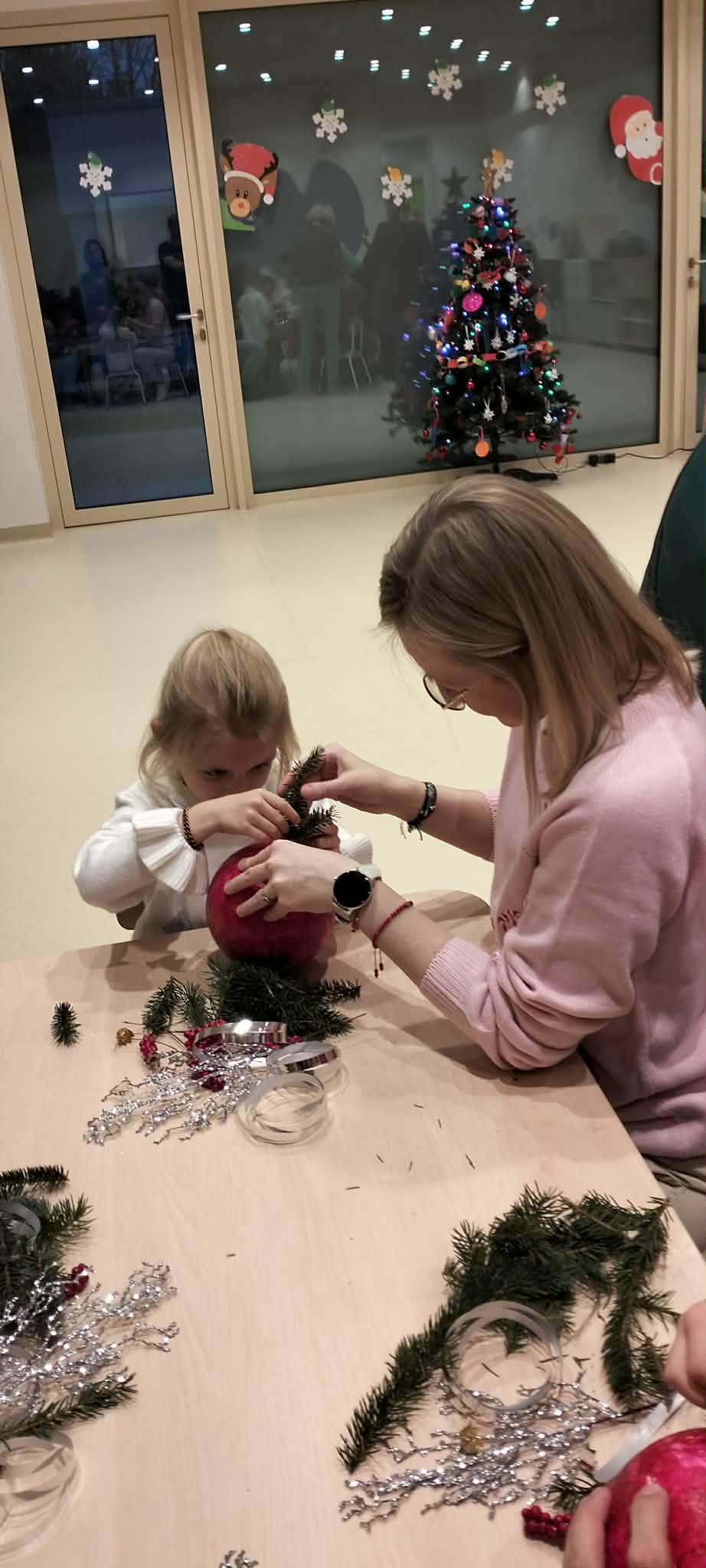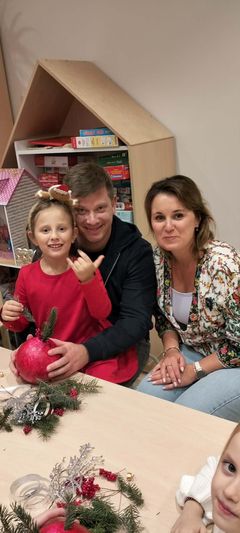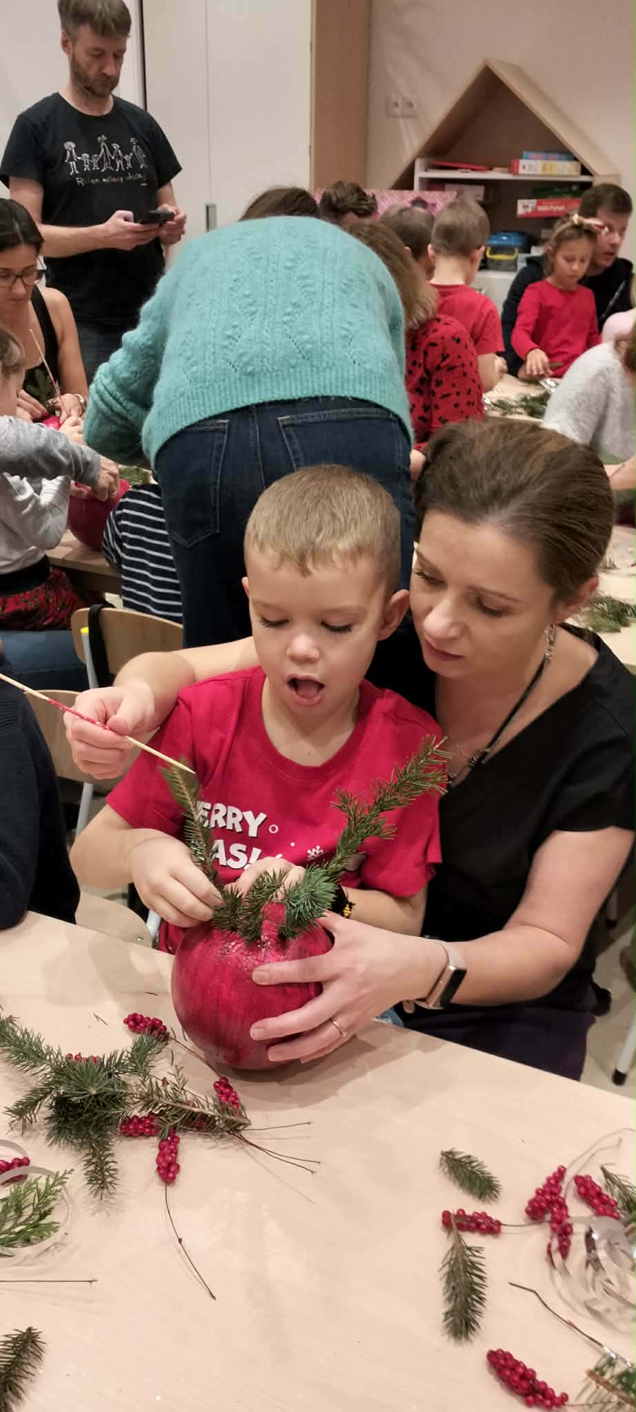 W grudniu spotkaliśmy się wspólnie z rodzicami, aby przygotować stroiki świąteczne. W tym roku przyozdabialiśmy bombkę, którą wcześniej pomalowaliśmy na czerwono. Piękne dodatki, srebrne wstążeczki oraz zielone gałązki wprowadziły do naszej sali nastrój świąt.