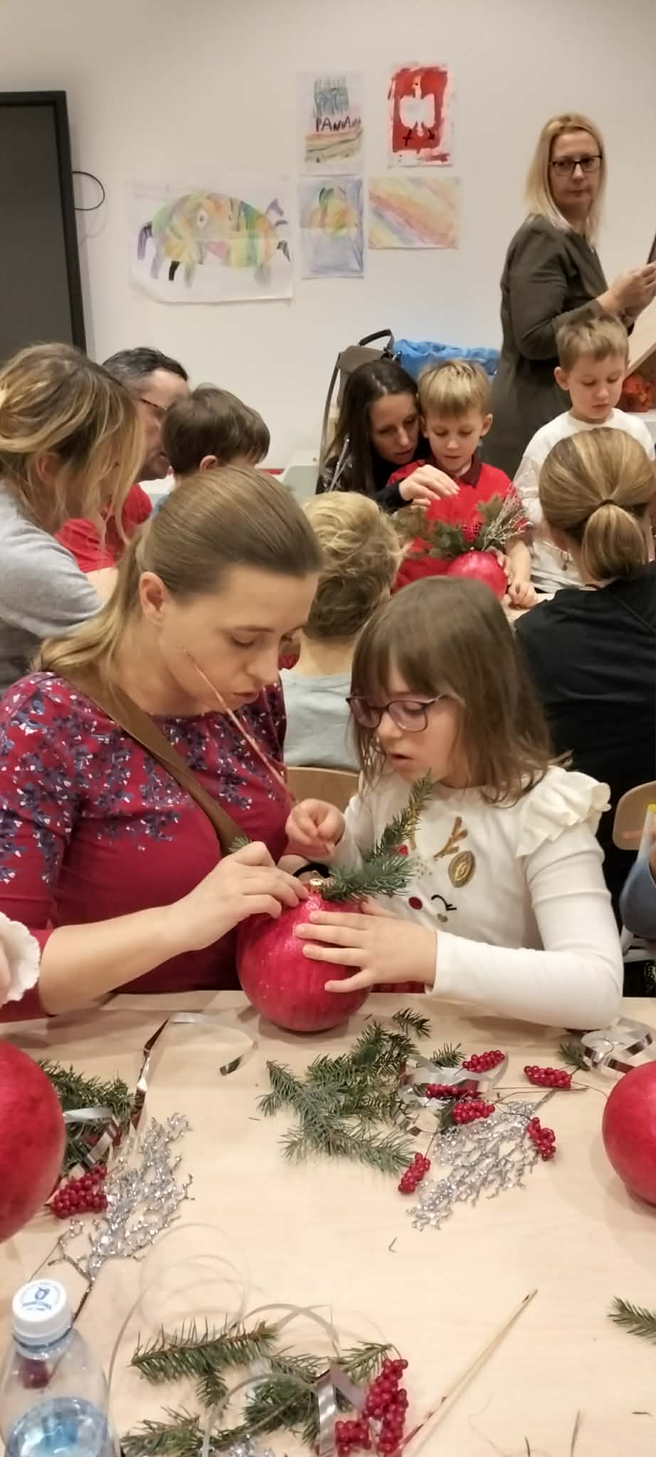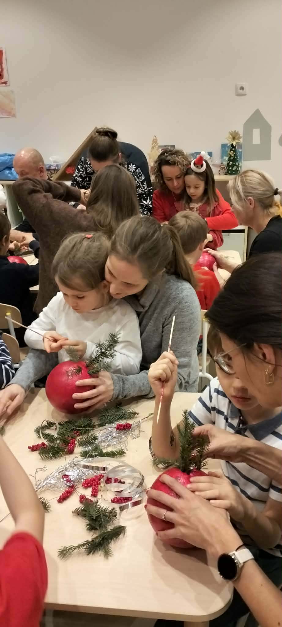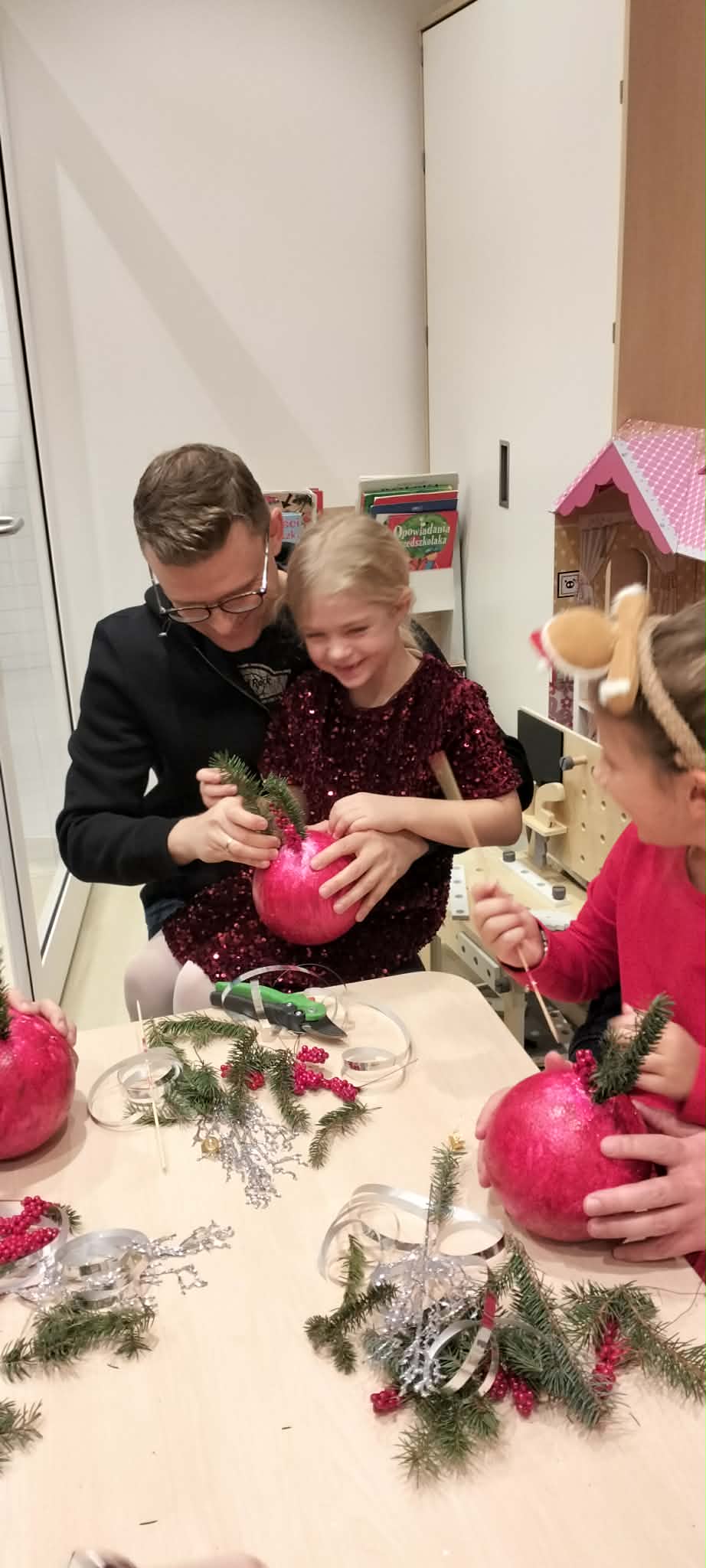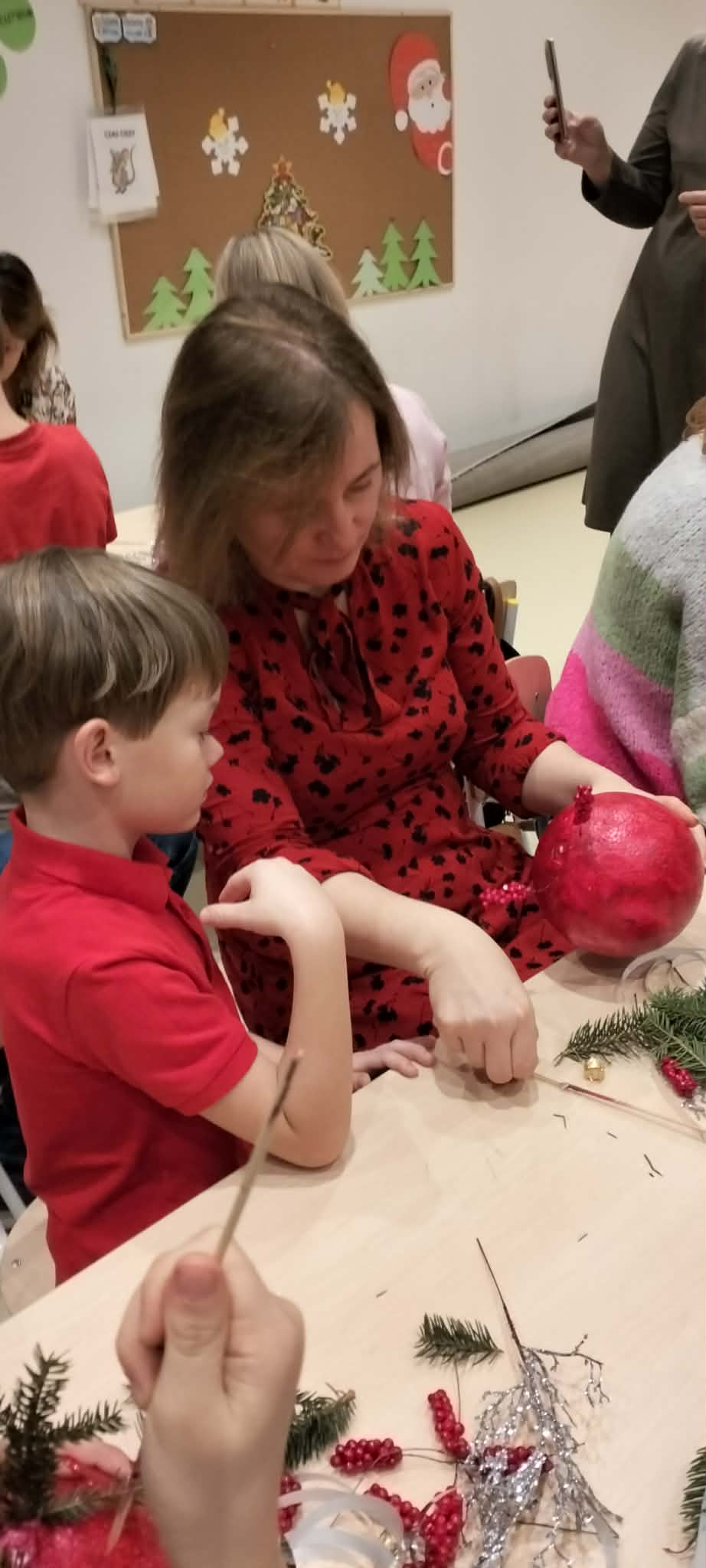 W grudniu spotkaliśmy się wspólnie z rodzicami, aby przygotować stroiki świąteczne. W tym roku przyozdabialiśmy bombkę, którą wcześniej pomalowaliśmy na czerwono. Piękne dodatki, srebrne wstążeczki oraz zielone gałązki wprowadziły do naszej sali nastrój świąt.