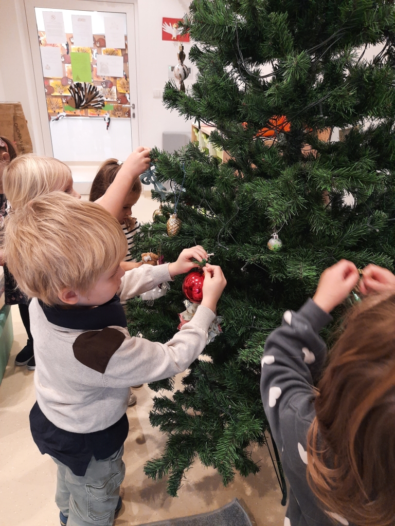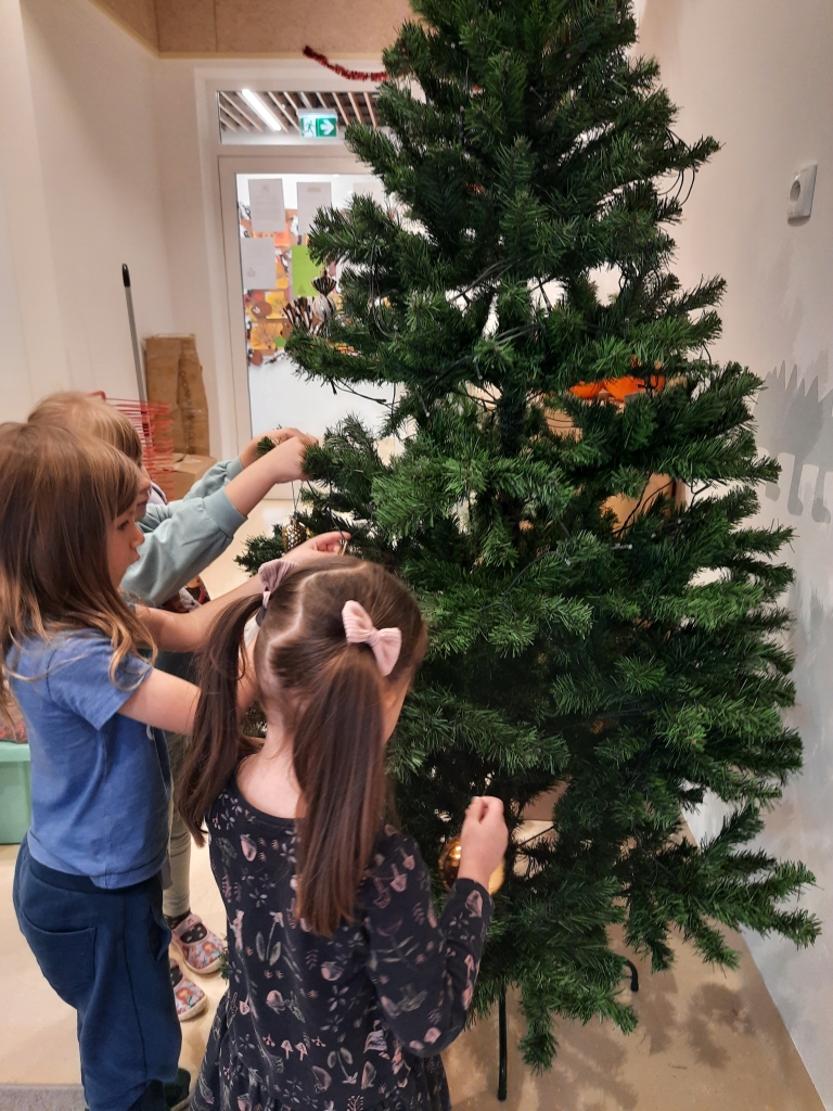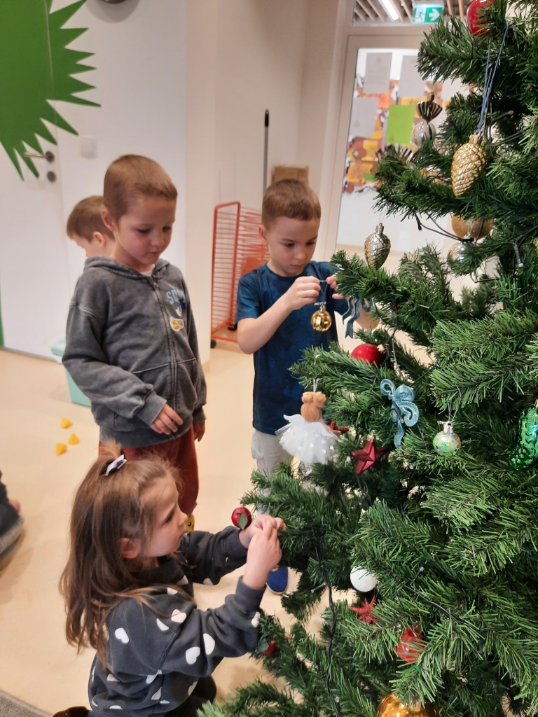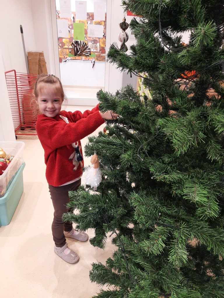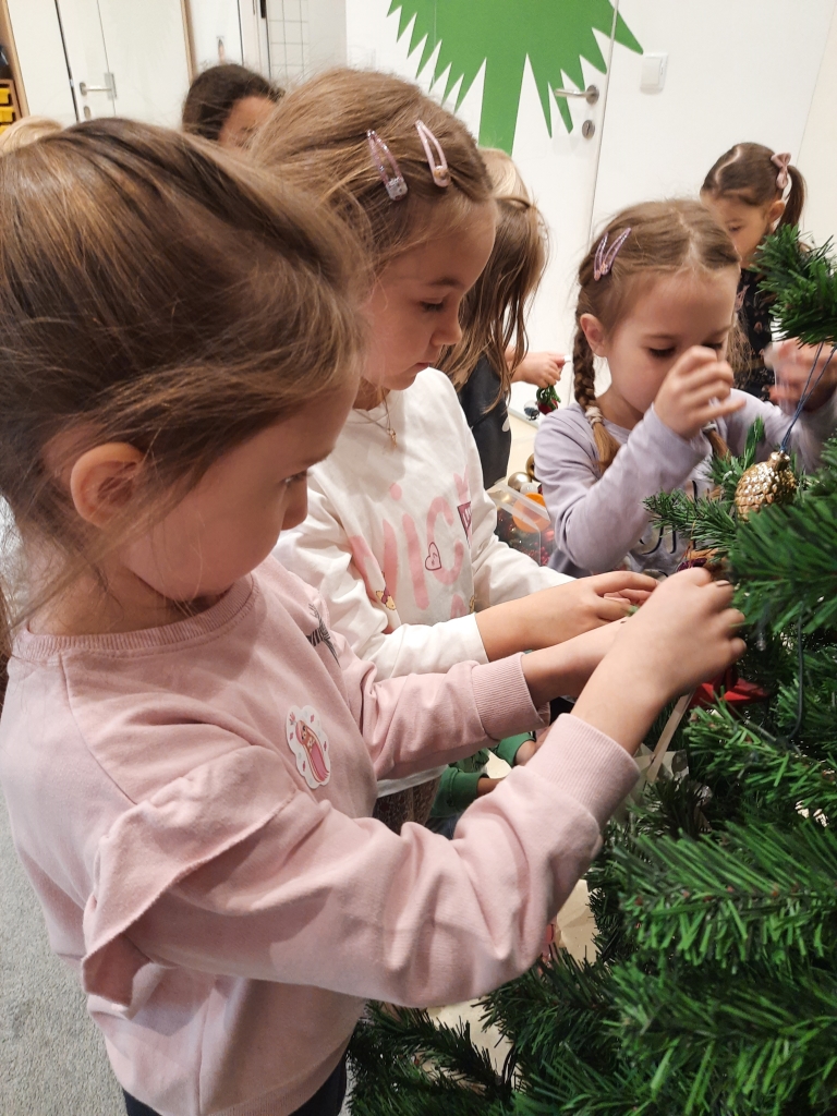 „Jeżyki” z wielkim zaangażowaniem zawieszały różnorodne ozdoby choinkowe:
