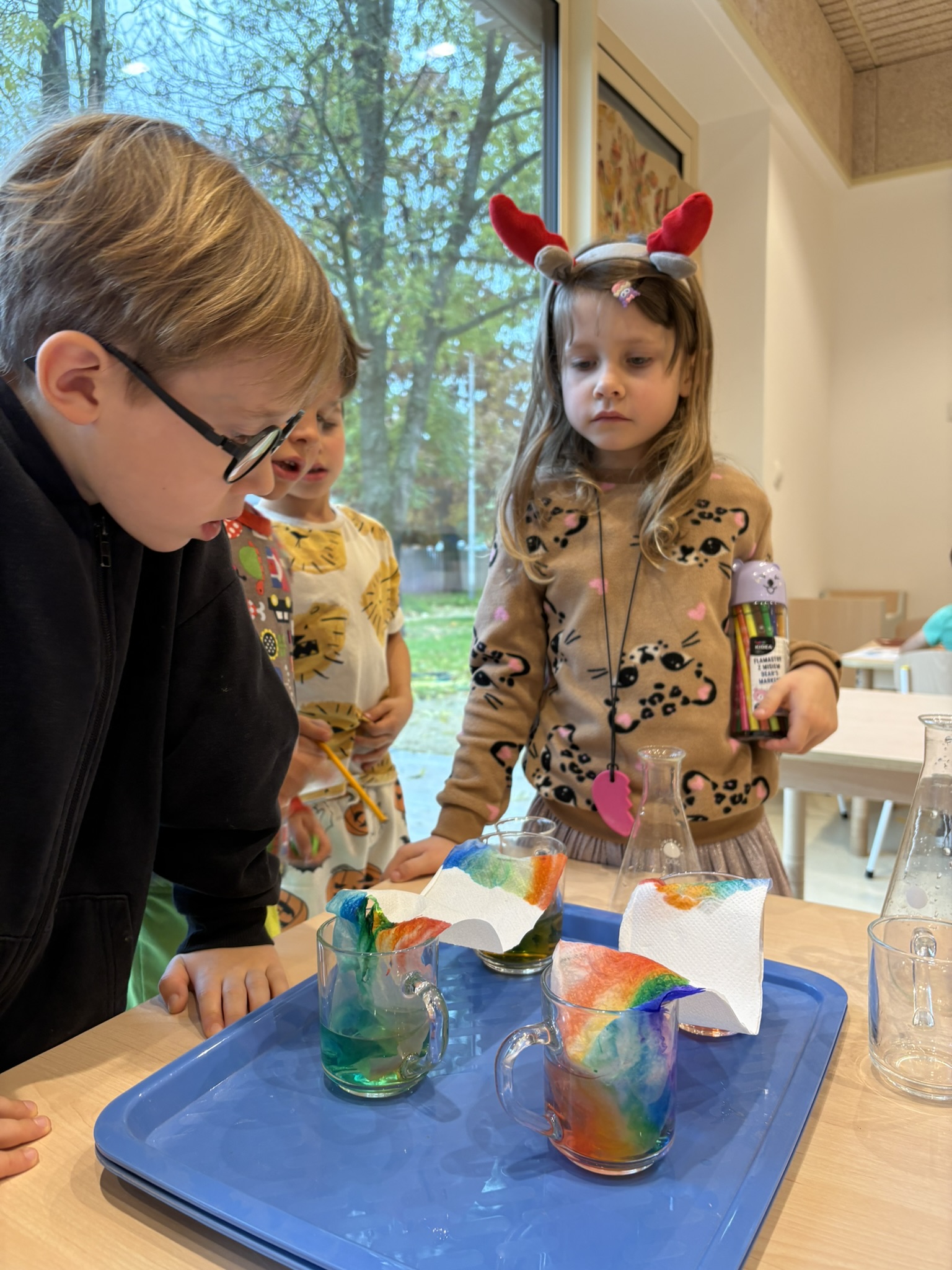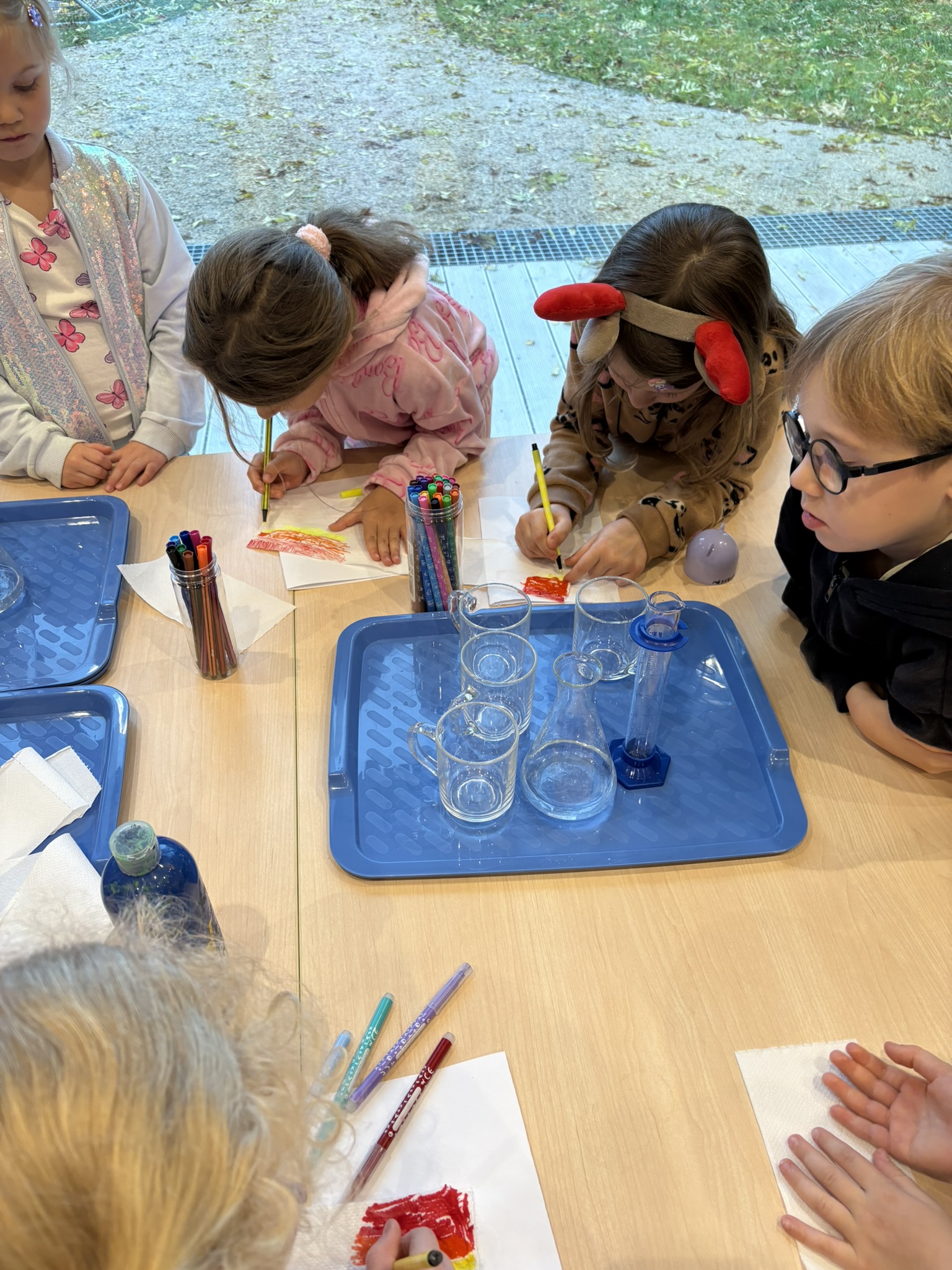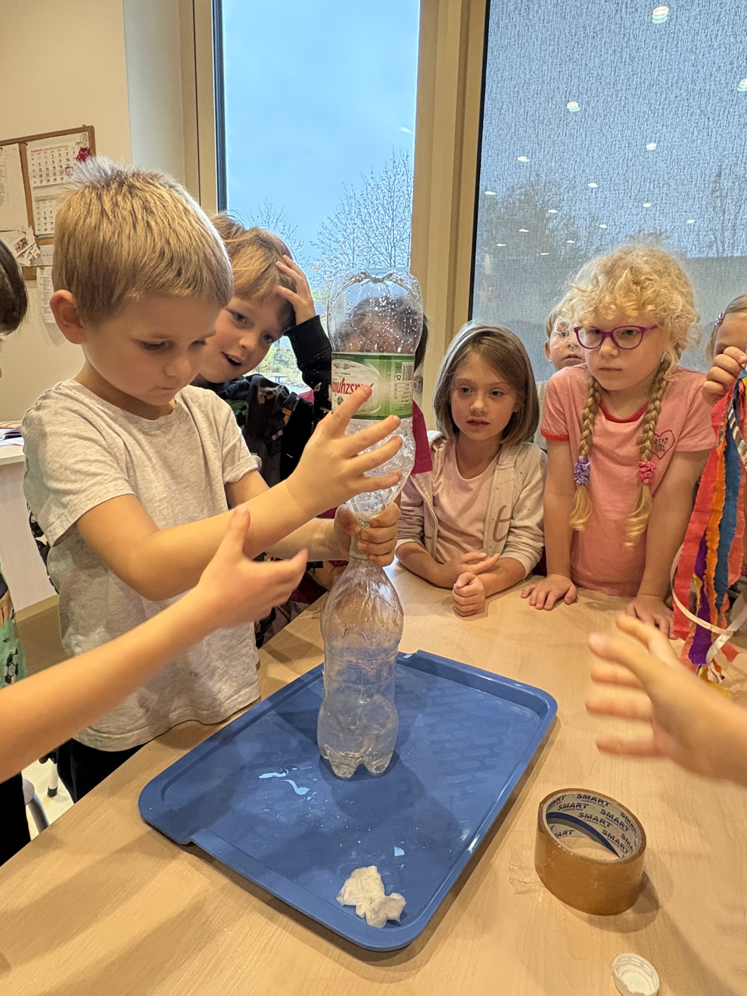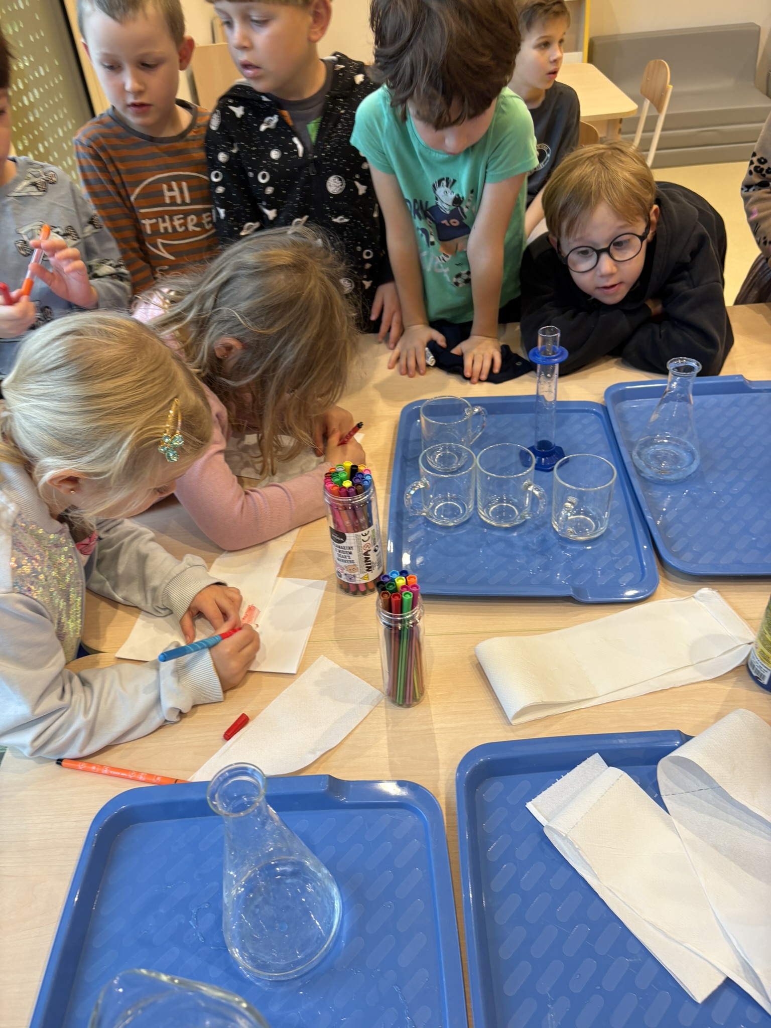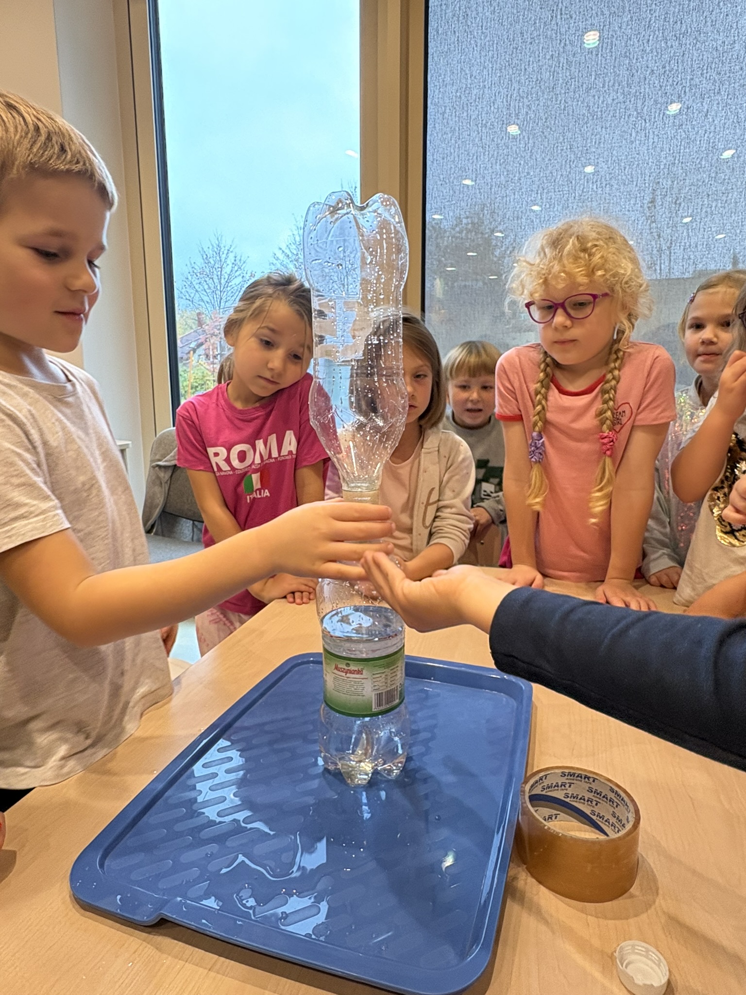 24.10 w naszej grupie odbyły się zajęcia badawcze poświęcone wodzie. Celem warsztatów było rozwijanie ciekawości poznawczej dzieci oraz zachęcanie ich do samodzielnego odkrywania właściwości substancji występujących w przyrodzie. Podczas zajęć dzieci obserwowały różne właściwości wody, tworzyły proste, ale efektowne eksperymenty – między innymi „tornado w butelce” i kolorową tęczę. W trakcie doświadczeń dzieci poznawały także matematyczne pojęcie objętości, porównywały ilości wody w różnych naczyniach, sprawdzały, ile wody mieści się w kubku, a ile w butelce, oraz uczyły się, że mimo zmiany kształtu naczynia – objętość cieczy pozostaje taka sama. Zajęcia stały się również okazją do rozmowy o zjawiskach pogodowych związanych z wodą – takich jak deszcz, śnieg, grad czy mgła. Dzieci dowiedziały się, skąd bierze się deszcz i jak przebiega obieg wody w przyrodzie. Dzięki wspólnej pracy dzieci mogły w praktyczny sposób doświadczyć, jak fascynujący i różnorodny jest świat nauki. Zajęcia dostarczyły wielu pozytywnych emocji, a jednocześnie rozwijały umiejętność obserwacji, wnioskowania, współpracy w grupie oraz myślenia matematycznego i przyrodniczego.