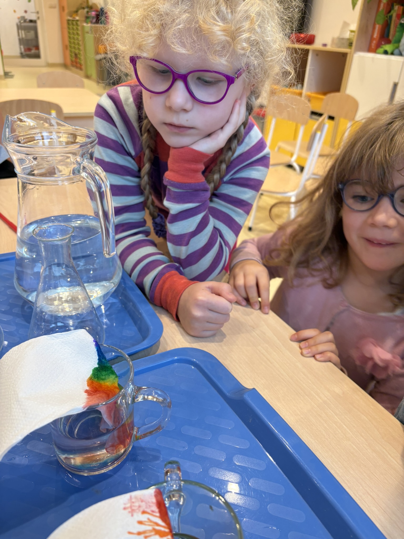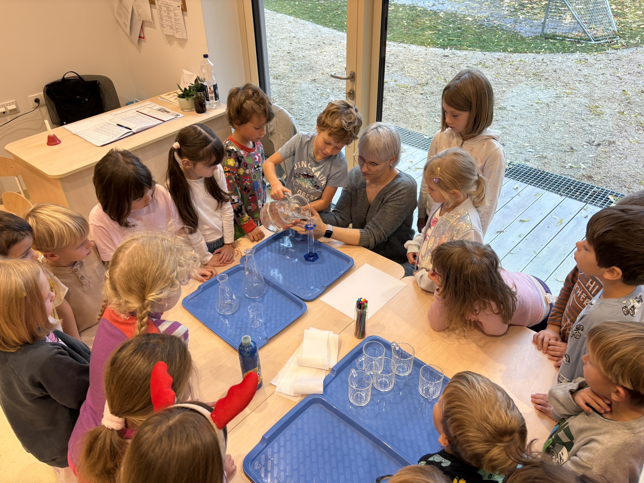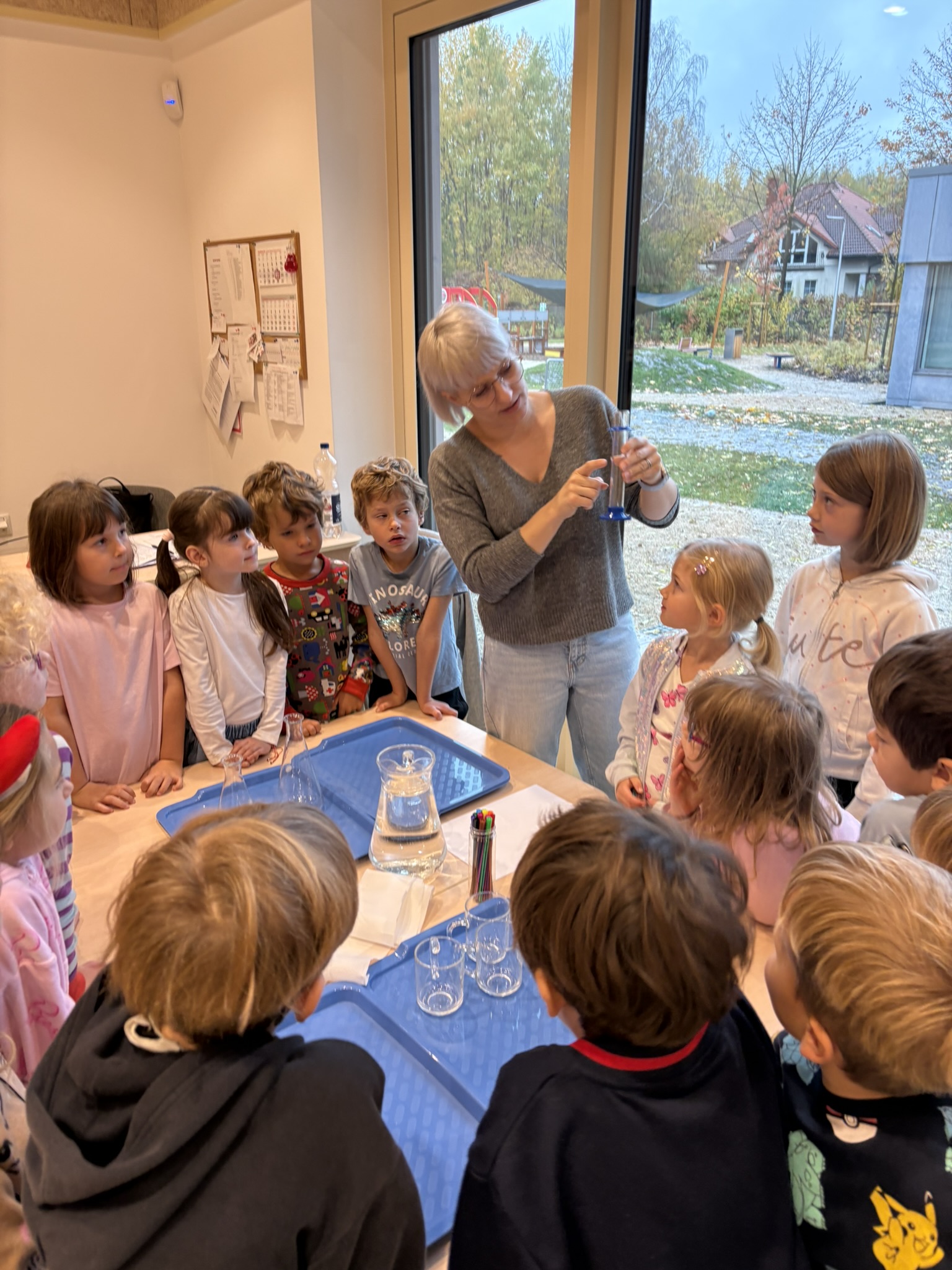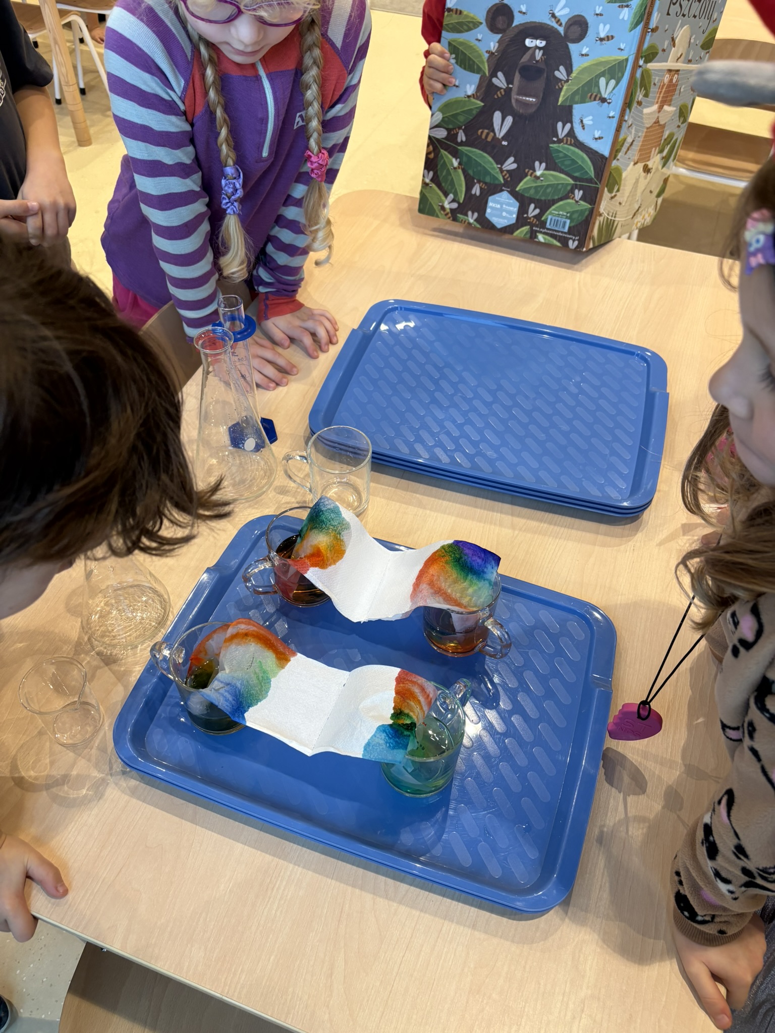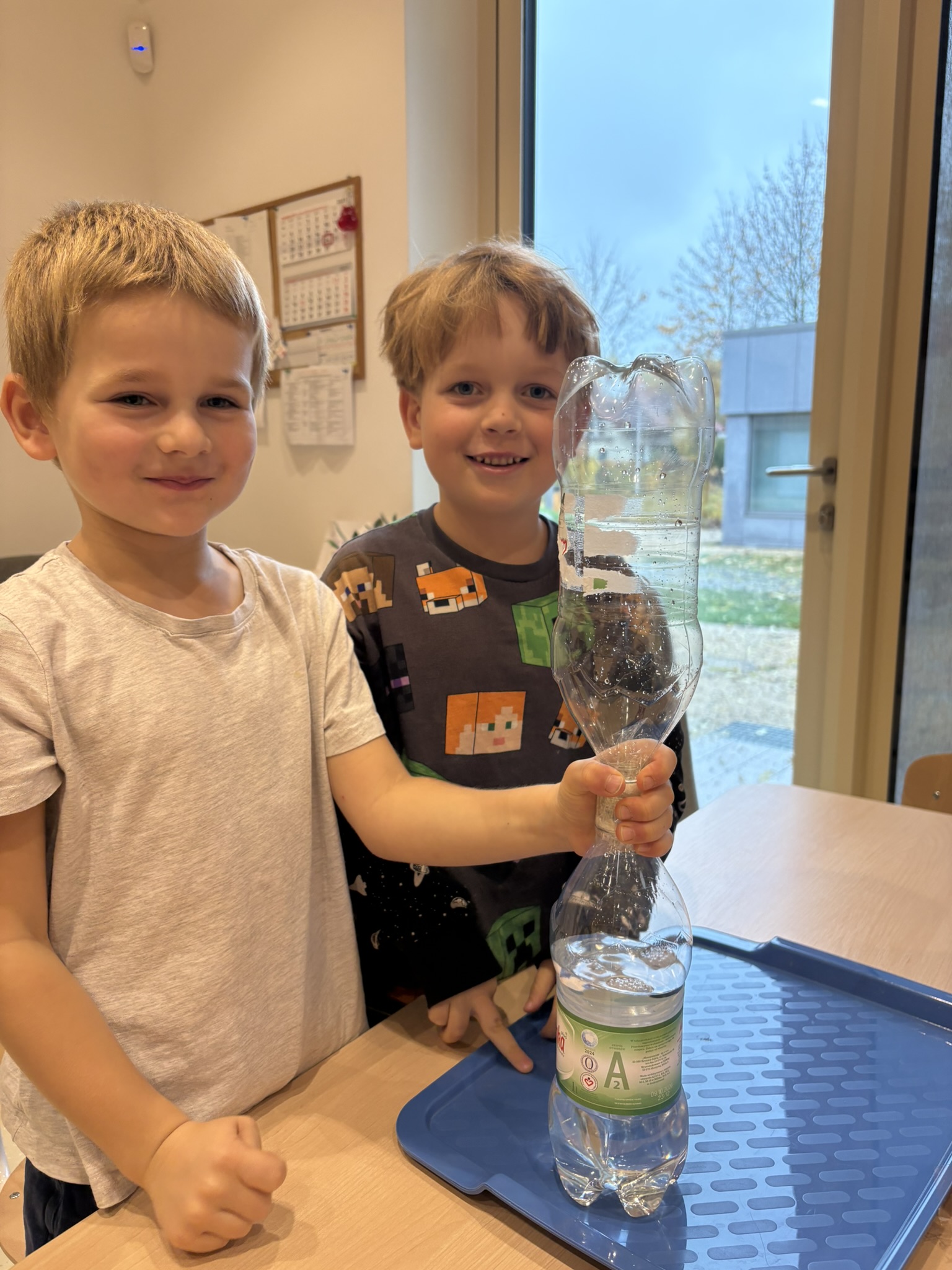 24.10 w naszej grupie odbyły się zajęcia badawcze poświęcone wodzie. Celem warsztatów było rozwijanie ciekawości poznawczej dzieci oraz zachęcanie ich do samodzielnego odkrywania właściwości substancji występujących w przyrodzie. Podczas zajęć dzieci obserwowały różne właściwości wody, tworzyły proste, ale efektowne eksperymenty – między innymi „tornado w butelce” i kolorową tęczę. W trakcie doświadczeń dzieci poznawały także matematyczne pojęcie objętości, porównywały ilości wody w różnych naczyniach, sprawdzały, ile wody mieści się w kubku, a ile w butelce, oraz uczyły się, że mimo zmiany kształtu naczynia – objętość cieczy pozostaje taka sama. Zajęcia stały się również okazją do rozmowy o zjawiskach pogodowych związanych z wodą – takich jak deszcz, śnieg, grad czy mgła. Dzieci dowiedziały się, skąd bierze się deszcz i jak przebiega obieg wody w przyrodzie. Dzięki wspólnej pracy dzieci mogły w praktyczny sposób doświadczyć, jak fascynujący i różnorodny jest świat nauki. Zajęcia dostarczyły wielu pozytywnych emocji, a jednocześnie rozwijały umiejętność obserwacji, wnioskowania, współpracy w grupie oraz myślenia matematycznego i przyrodniczego.