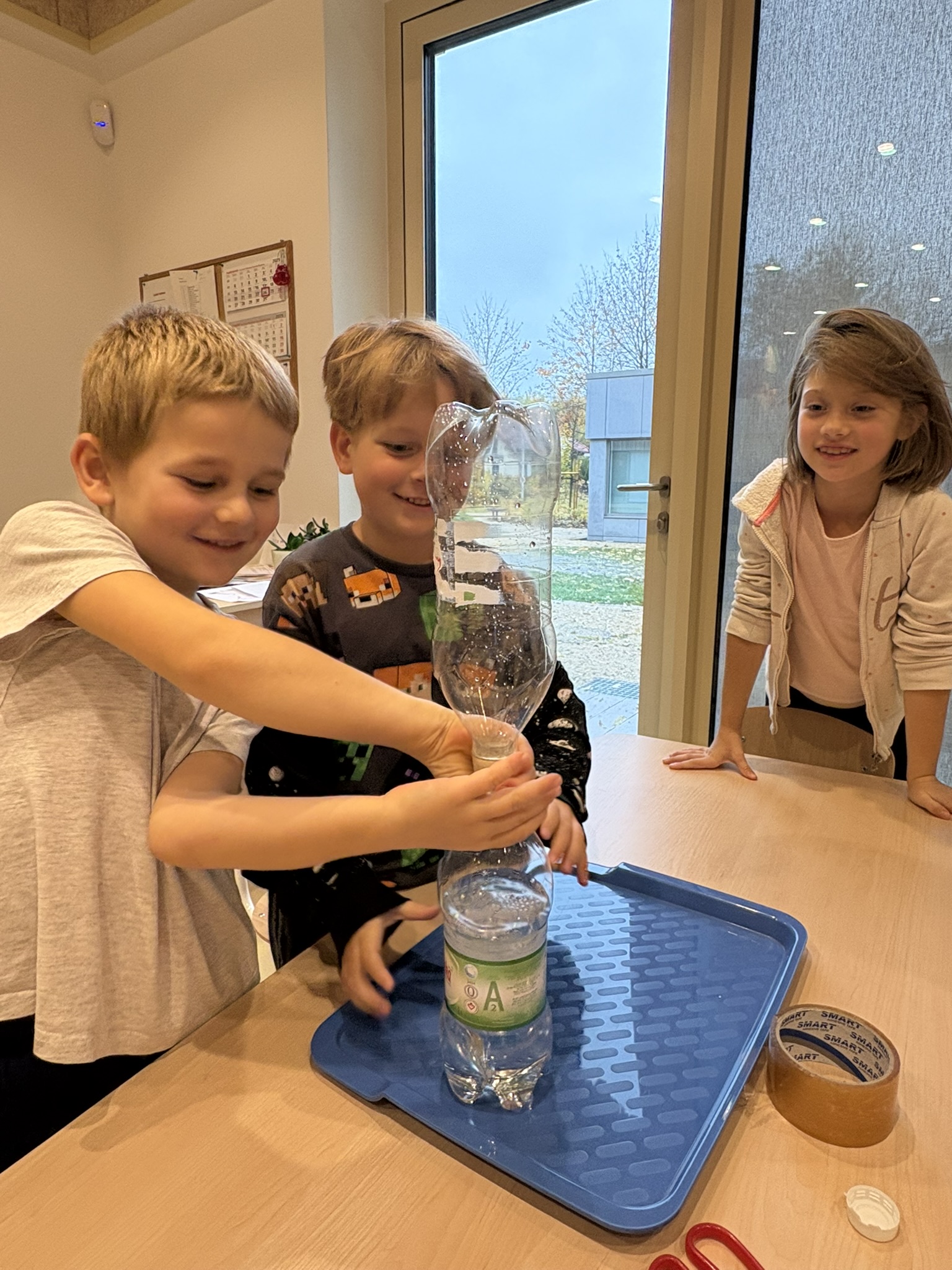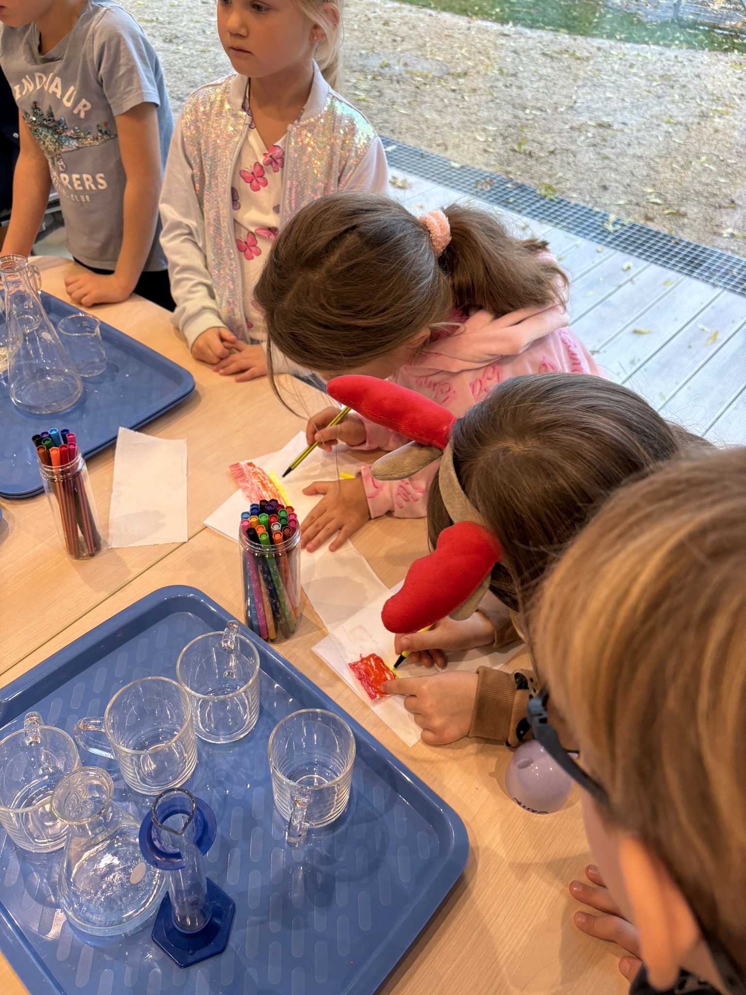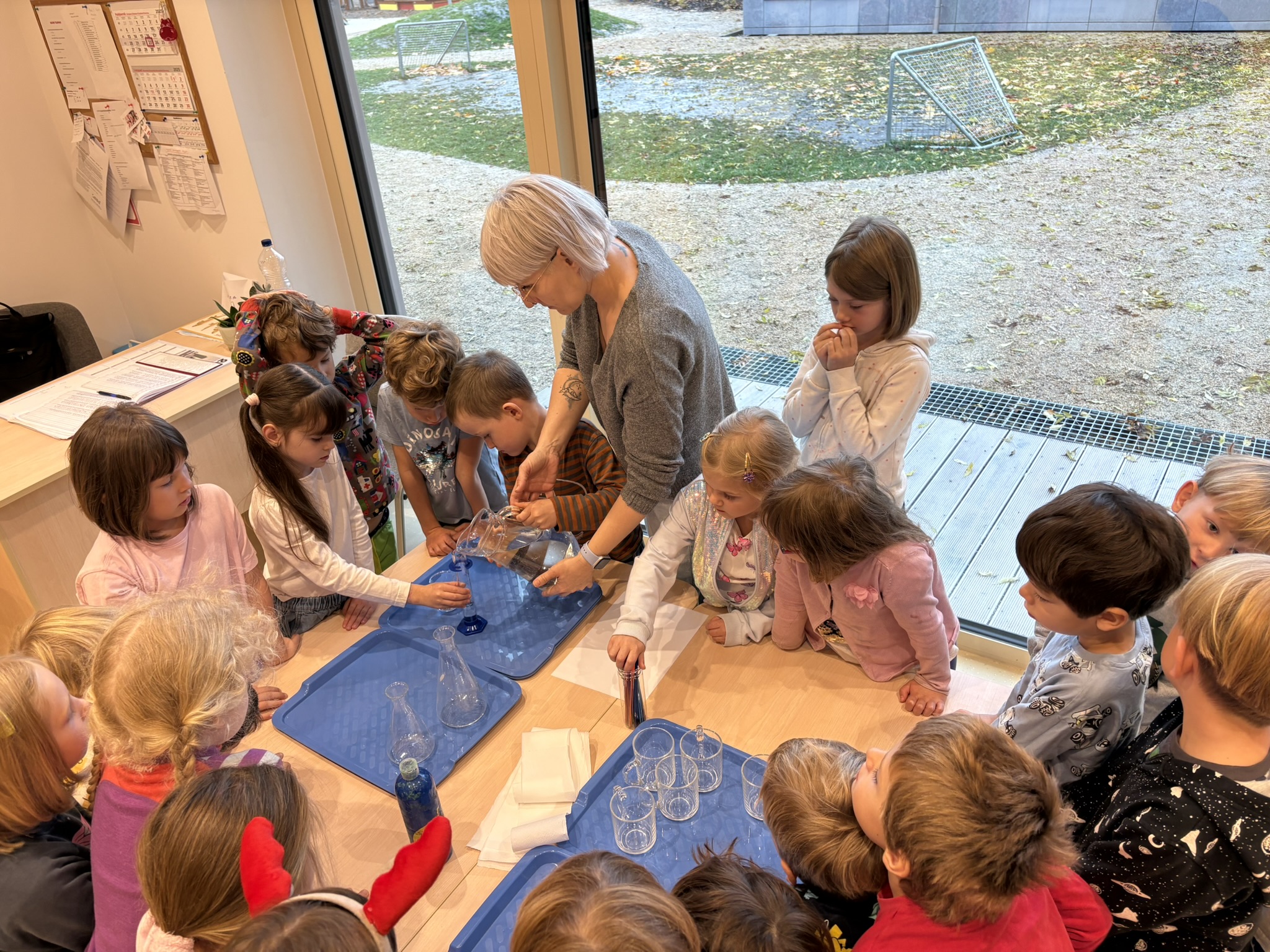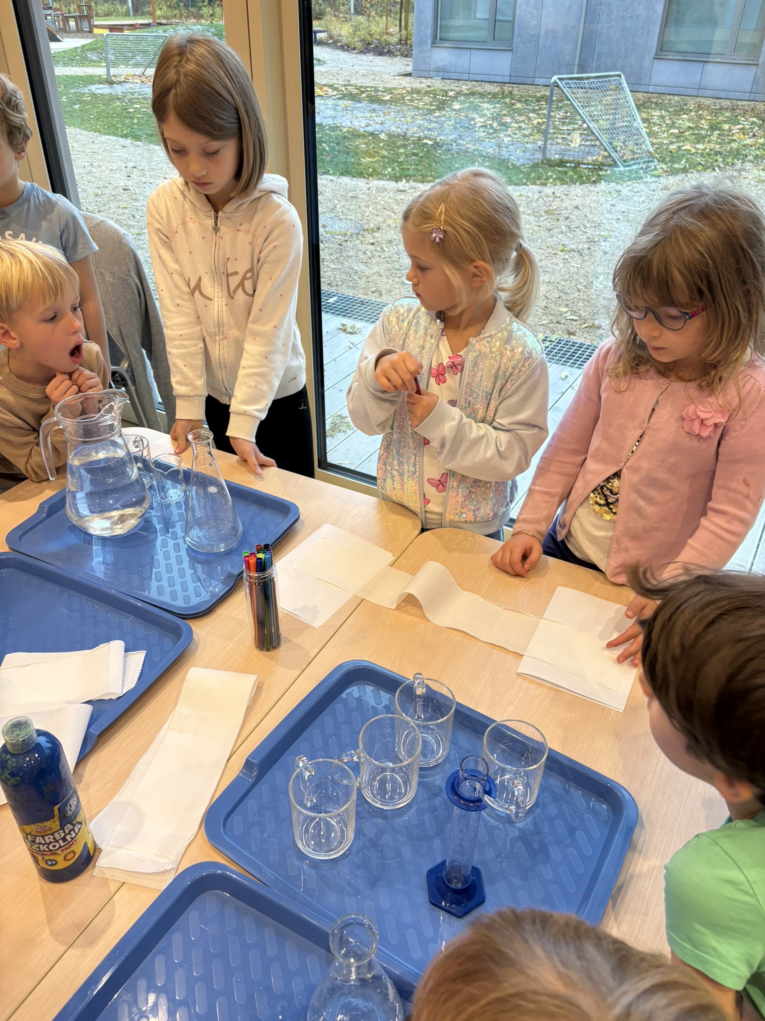 24.10 w naszej grupie odbyły się zajęcia badawcze poświęcone wodzie. Celem warsztatów było rozwijanie ciekawości poznawczej dzieci oraz zachęcanie ich do samodzielnego odkrywania właściwości substancji występujących w przyrodzie. Podczas zajęć dzieci obserwowały różne właściwości wody, tworzyły proste, ale efektowne eksperymenty – między innymi „tornado w butelce” i kolorową tęczę. W trakcie doświadczeń dzieci poznawały także matematyczne pojęcie objętości, porównywały ilości wody w różnych naczyniach, sprawdzały, ile wody mieści się w kubku, a ile w butelce, oraz uczyły się, że mimo zmiany kształtu naczynia – objętość cieczy pozostaje taka sama. Zajęcia stały się również okazją do rozmowy o zjawiskach pogodowych związanych z wodą – takich jak deszcz, śnieg, grad czy mgła. Dzieci dowiedziały się, skąd bierze się deszcz i jak przebiega obieg wody w przyrodzie. Dzięki wspólnej pracy dzieci mogły w praktyczny sposób doświadczyć, jak fascynujący i różnorodny jest świat nauki. Zajęcia dostarczyły wielu pozytywnych emocji, a jednocześnie rozwijały umiejętność obserwacji, wnioskowania, współpracy w grupie oraz myślenia matematycznego i przyrodniczego.