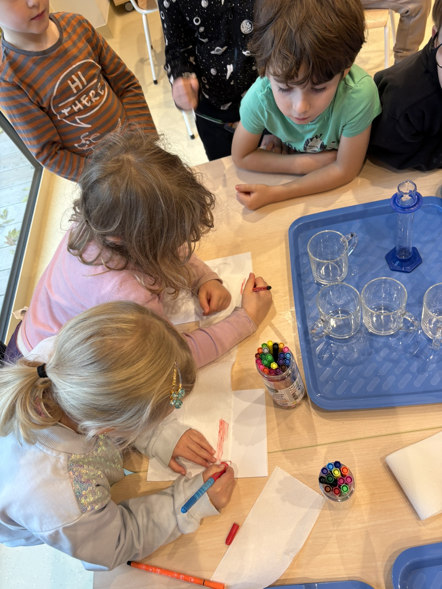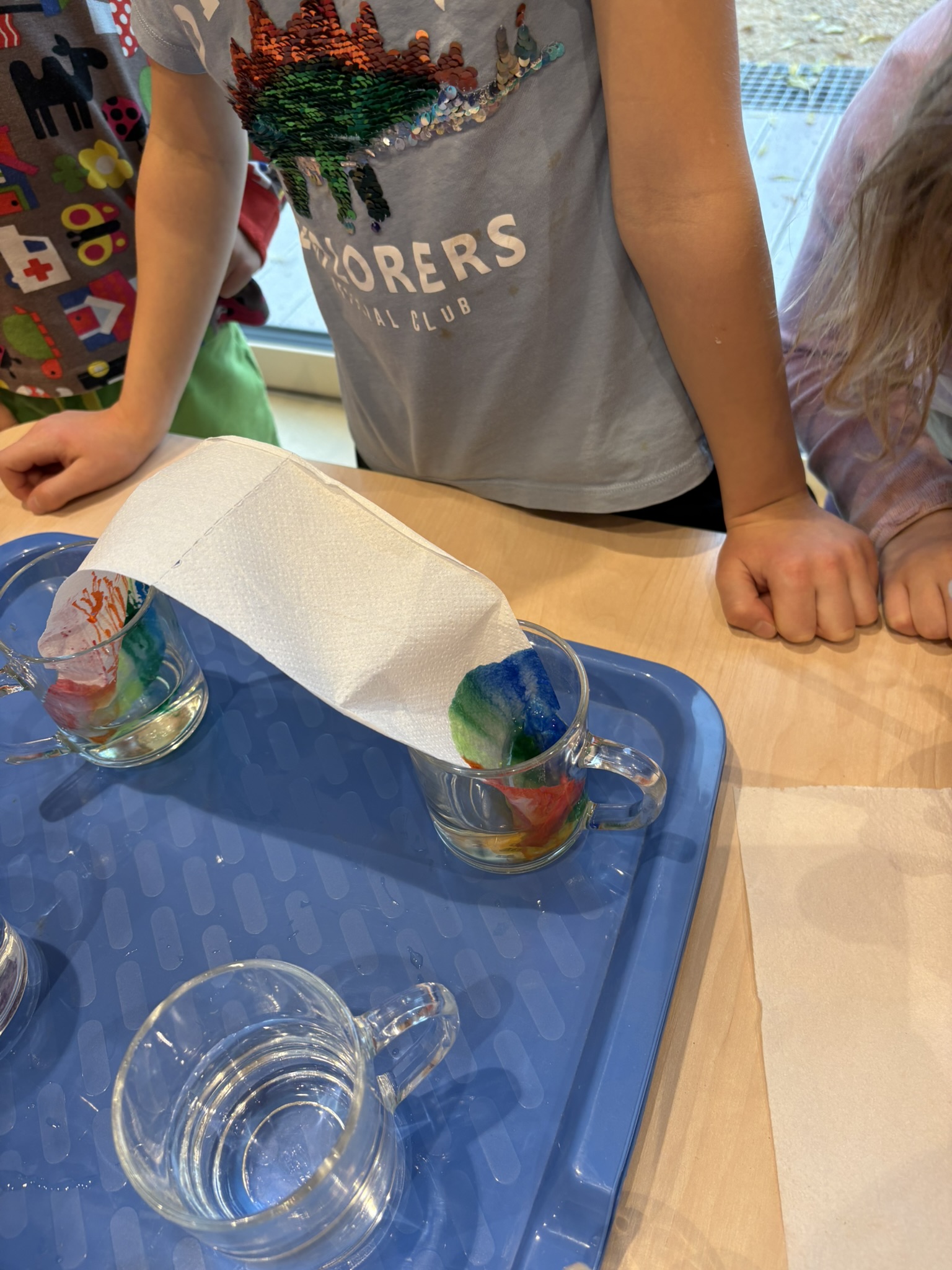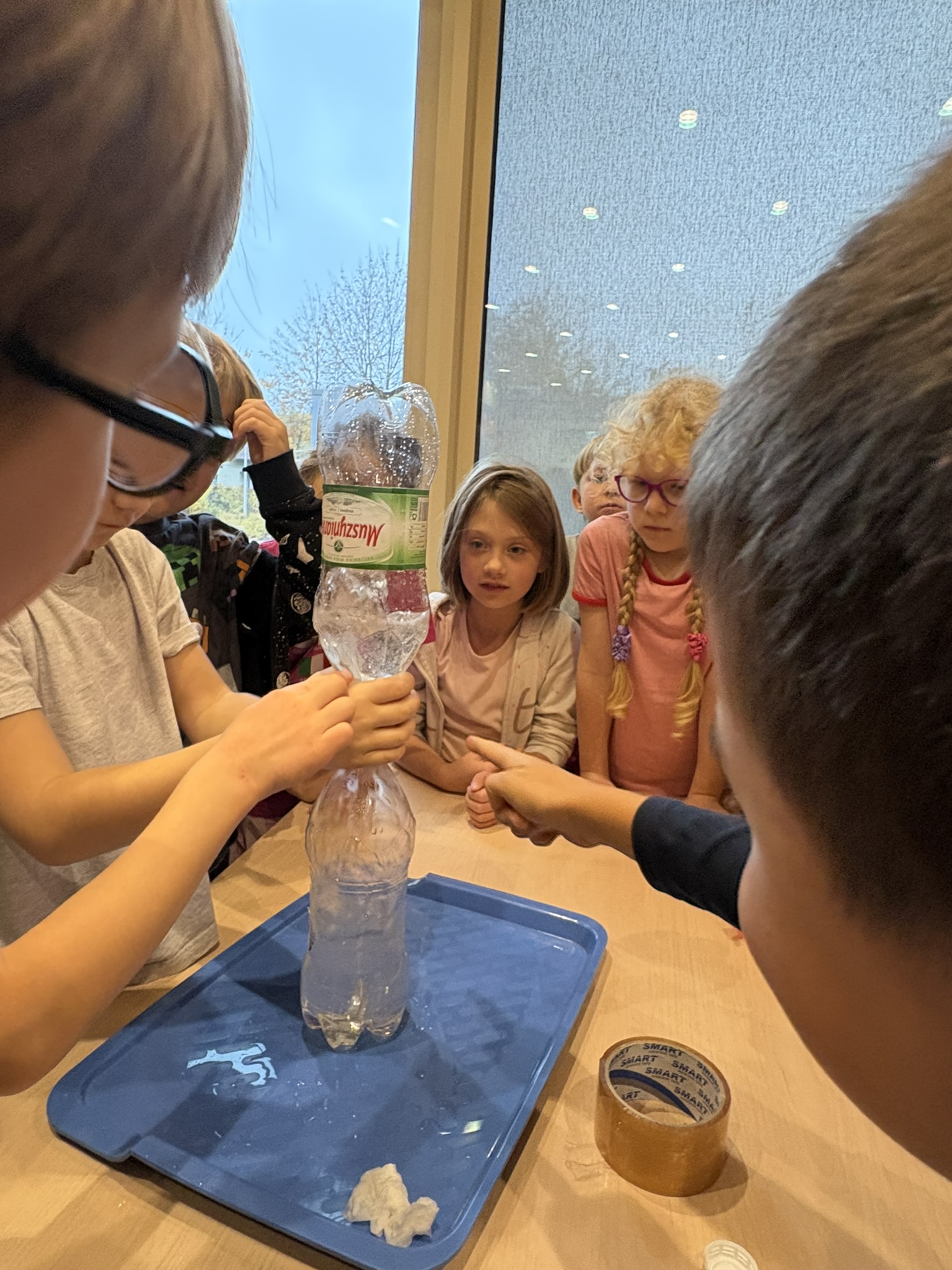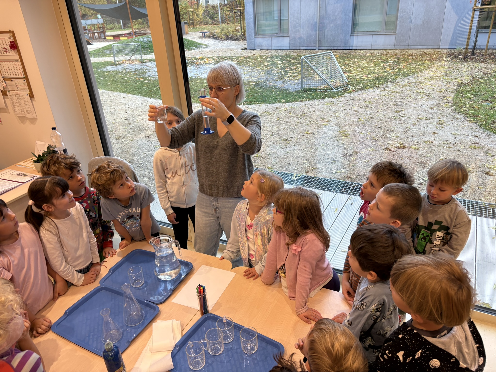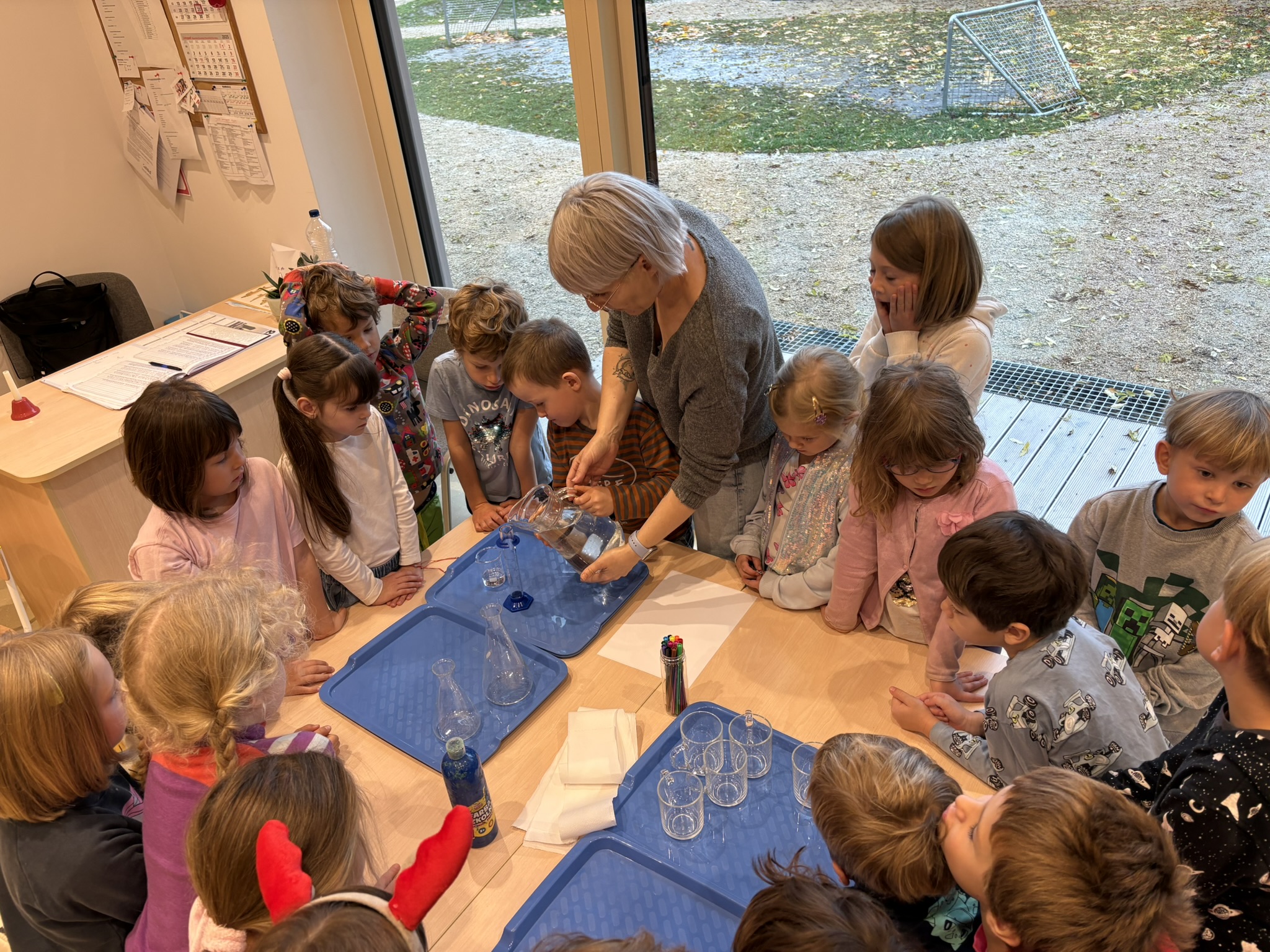 24.10 w naszej grupie odbyły się zajęcia badawcze poświęcone wodzie. Celem warsztatów było rozwijanie ciekawości poznawczej dzieci oraz zachęcanie ich do samodzielnego odkrywania właściwości substancji występujących w przyrodzie. Podczas zajęć dzieci obserwowały różne właściwości wody, tworzyły proste, ale efektowne eksperymenty – między innymi „tornado w butelce” i kolorową tęczę. W trakcie doświadczeń dzieci poznawały także matematyczne pojęcie objętości, porównywały ilości wody w różnych naczyniach, sprawdzały, ile wody mieści się w kubku, a ile w butelce, oraz uczyły się, że mimo zmiany kształtu naczynia – objętość cieczy pozostaje taka sama. Zajęcia stały się również okazją do rozmowy o zjawiskach pogodowych związanych z wodą – takich jak deszcz, śnieg, grad czy mgła. Dzieci dowiedziały się, skąd bierze się deszcz i jak przebiega obieg wody w przyrodzie. Dzięki wspólnej pracy dzieci mogły w praktyczny sposób doświadczyć, jak fascynujący i różnorodny jest świat nauki. Zajęcia dostarczyły wielu pozytywnych emocji, a jednocześnie rozwijały umiejętność obserwacji, wnioskowania, współpracy w grupie oraz myślenia matematycznego i przyrodniczego.